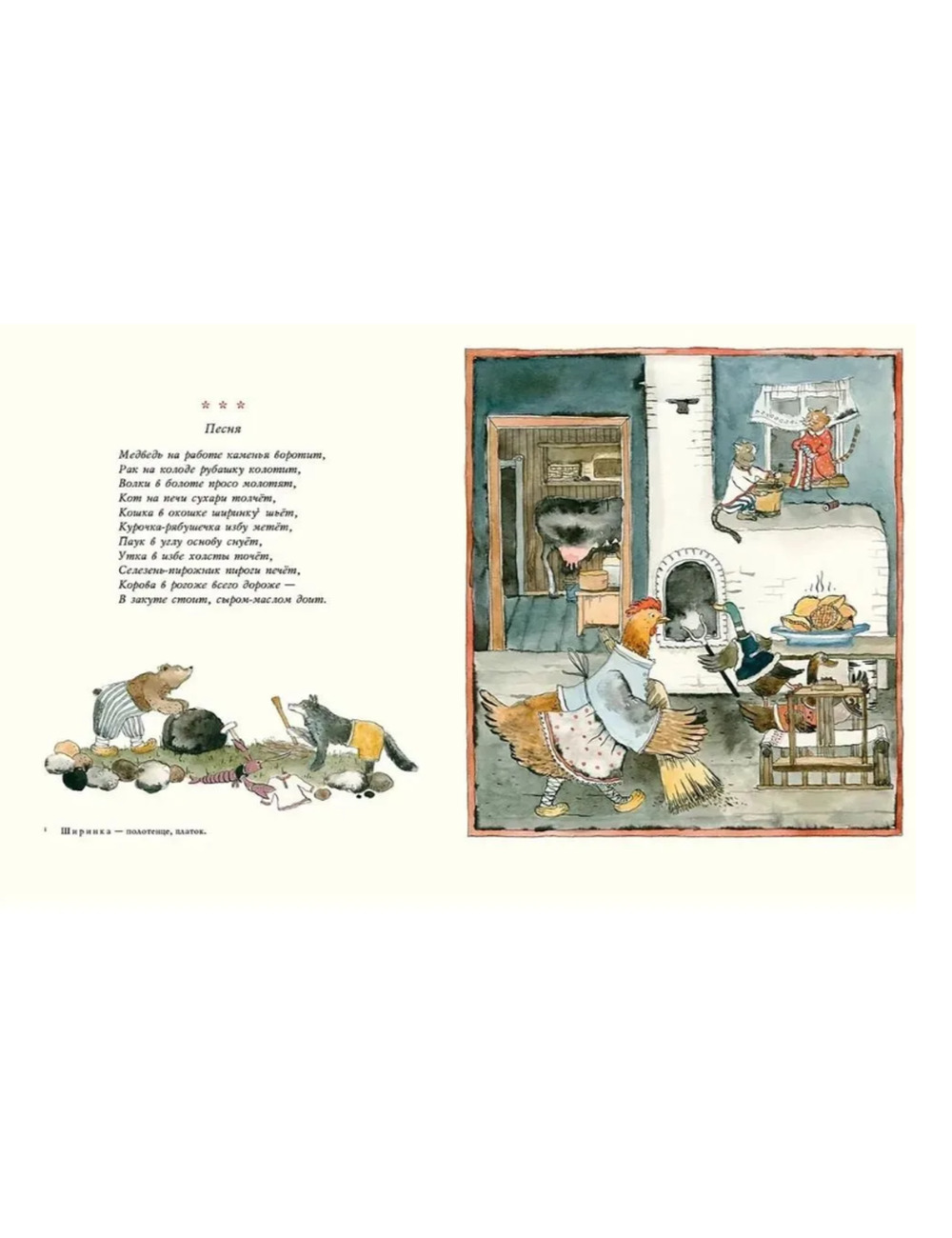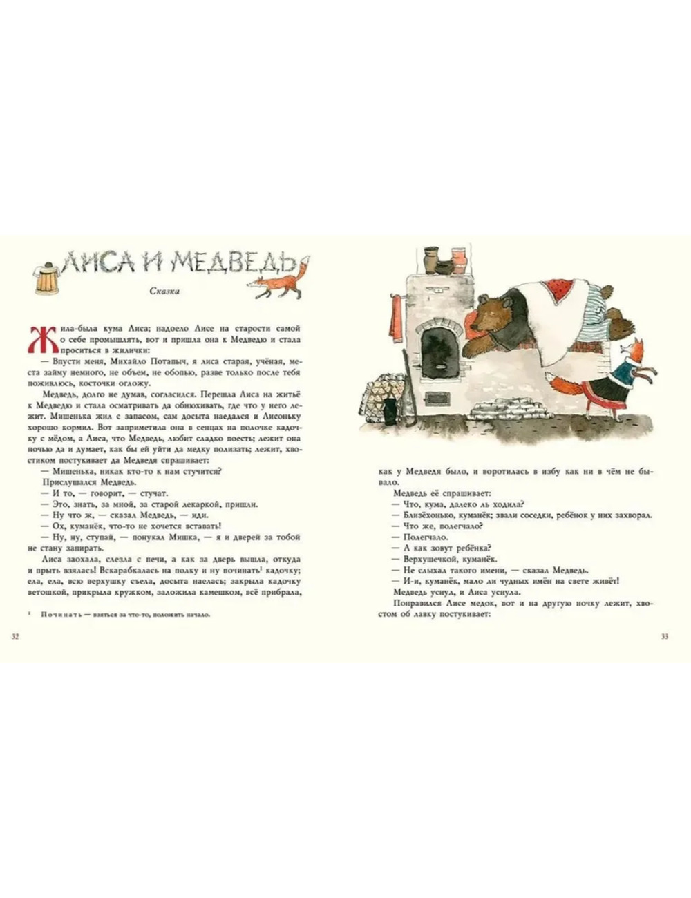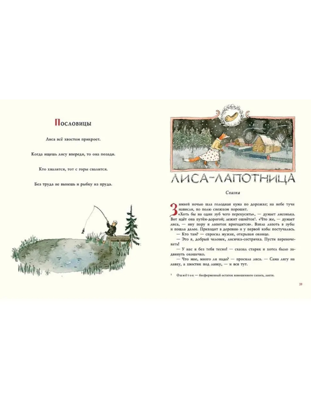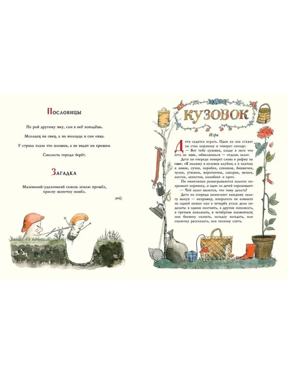 Русский фольклор — древняя и важная часть нашей культуры. Из поколения в поколение передавались былины, сказки, пословицы — они учили и воспитывали, развлекали и поддерживали в трудную минуту. В каждом тексте — от сказки с затейливым сюжетом до короткой поговорки — живут народная мудрость и смекалка, отражается богатство речи.В этот замечательный сборник вошли сказки, игры, загадки, пословицы, скороговорки. Маленькие читатели узнают, почему грибы решили с ягодами воевать, как смекалистый мужик медведя перехитрил, как собака Жучка спасла Снегурочку от лесных зверей, а девочка Малашечка — маленького братца от Бабы Яги. Познакомятся с играми, в которые играли их ровесники больше века назад. А загадки, пословицы и скороговорки помогут глубже узнать родную речь.Сборник проиллюстрирован лёгкими живописными рисунками Марии Сутягиной.