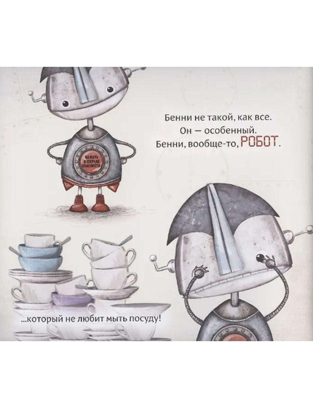 Бенни - маленький робот. Он живёт на Планете Роботов вместе с мамой и любимой робокошкой Спарки. У него есть одна-единственная большая красная кнопка на животе, которую можно нажать только в случае настоящей ОПАСНОСТИ.