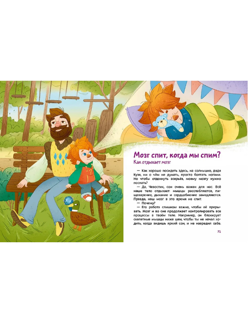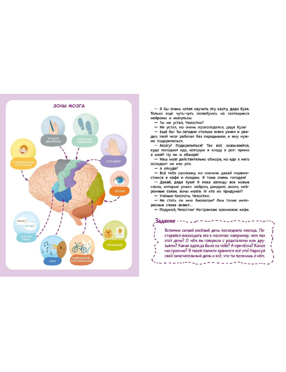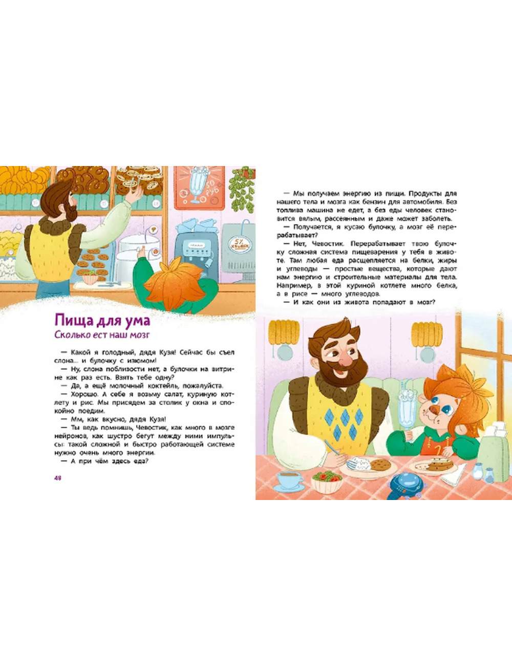 В новой энциклопедии Чевостик и дядя Кузя отправятся в необычное путешествие и выяснят, как работает человеческий мозг, из каких клеток он состоит, как контролирует весь организм, что ему в этом помогает, какие области мозга отвечают за важные функции и многое другое. Отправляйся в новое путешествие с любимыми героями, и ты узнаешь такое, что даже и не мог себе вообразить!