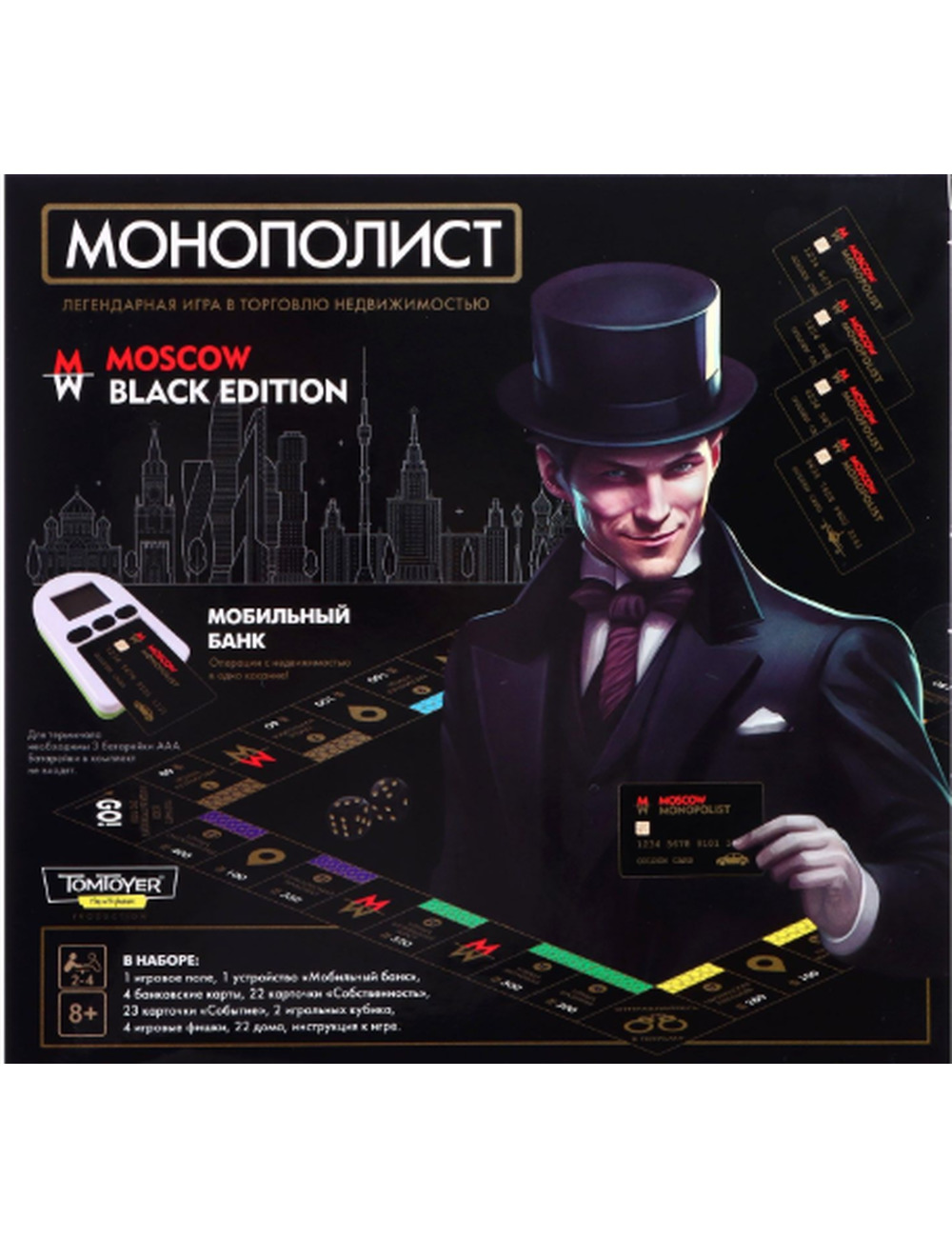 Монополист — крупный предприниматель, который контролирует весь рынок. Перед вами легендарная игра в торговлю недвижимостью. Проведение сделок, аукционов и прочих финансовых операций в этой игре происходит при помощи банковских карт через электронный мобильный банк. Количество игроков: от 2 до 4 бизнесменов.