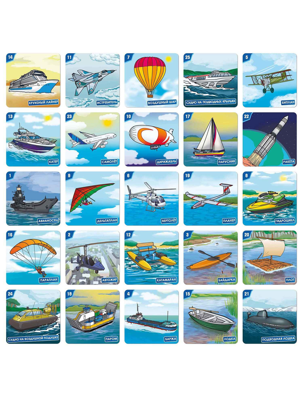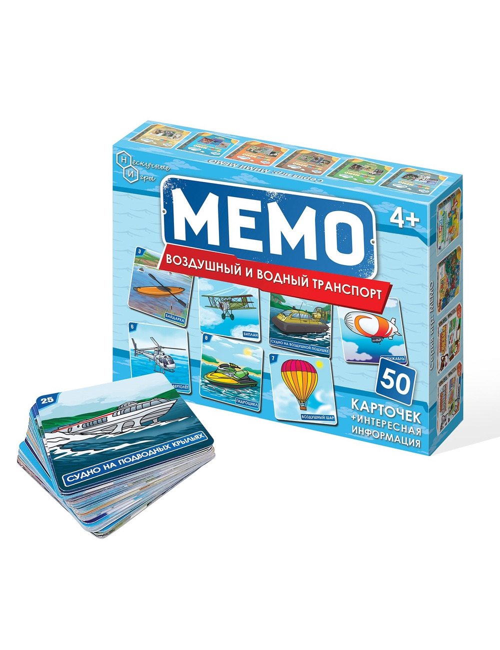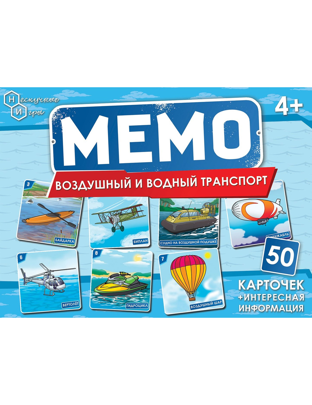 Карточная настольная игра Мемо "Воздушный и водный транспорт" бренда Нескучные Игры — это уникальная коллекция из 25 пар карточек (всего 50 карточек) с изображениями воздушного и водного транспорта.