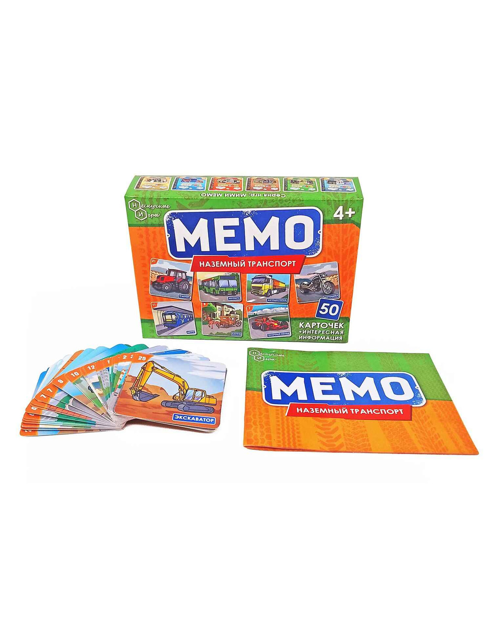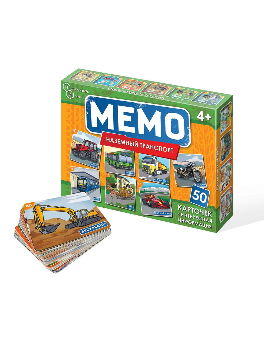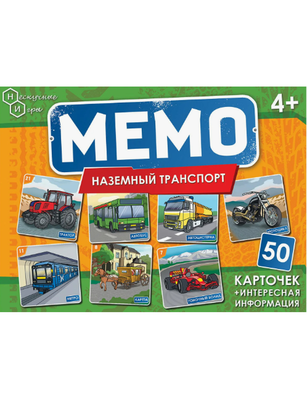 Карточная настольная игра Мемо "Наземный транспорт" бренда Нескучные Игры — это уникальная коллекция из 25 пар карточек (всего 50 карточек) с изображениями наземного транспорта.