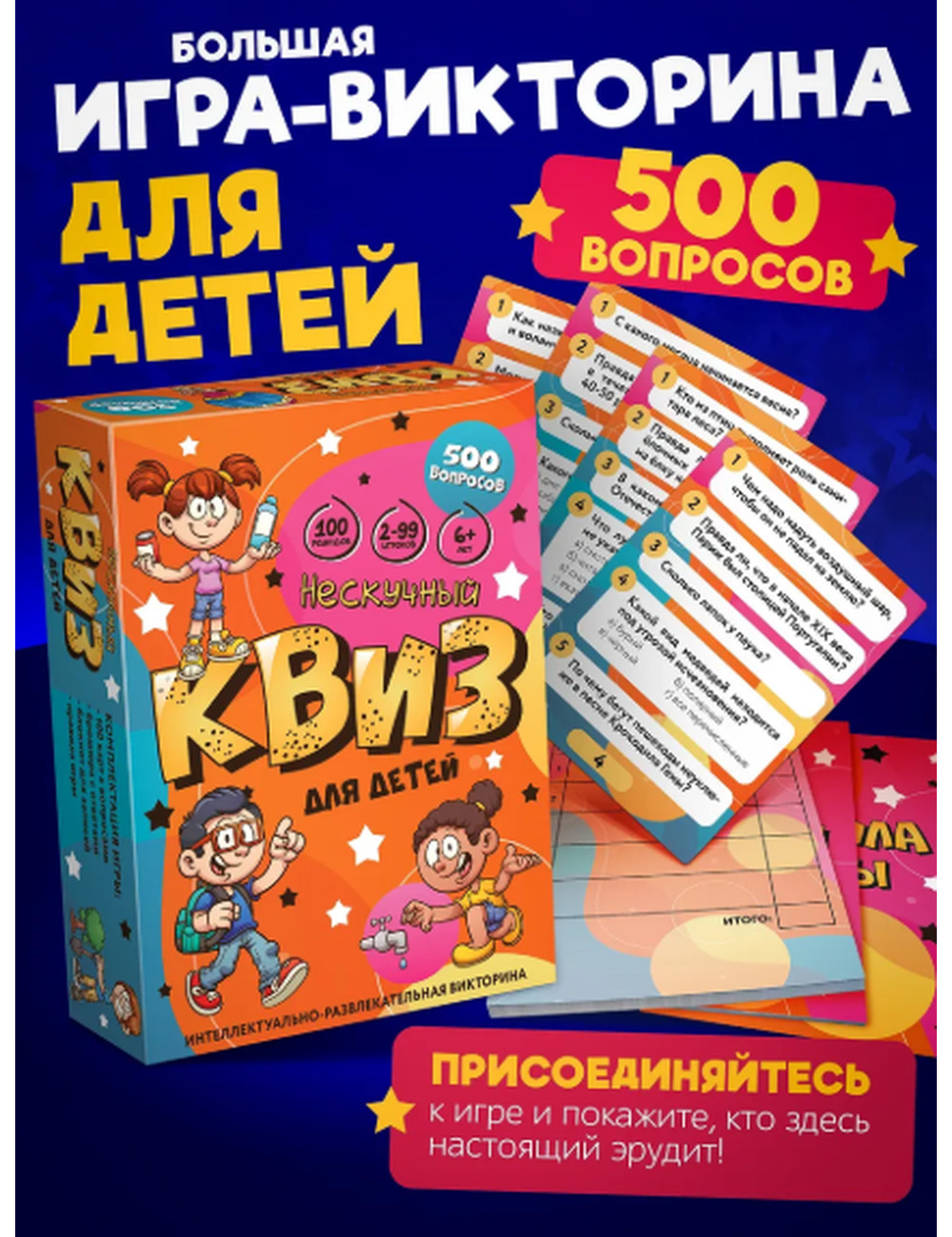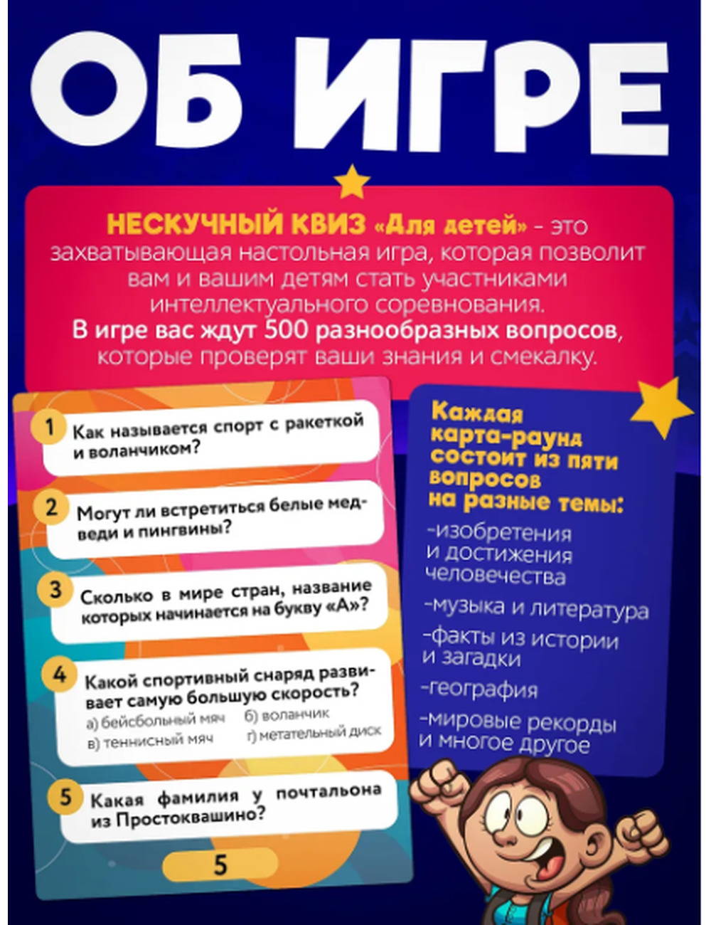 Нескучный квиз для детей – это увлекательная и познавательная настольная игра, которая позволит вам и вашим детям стать участниками интеллектуального соревнования.