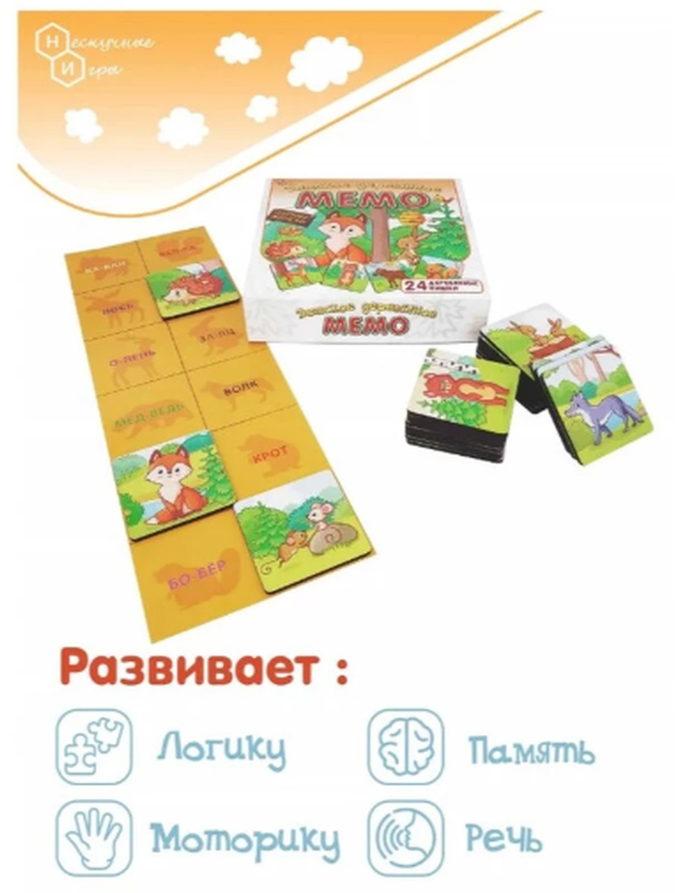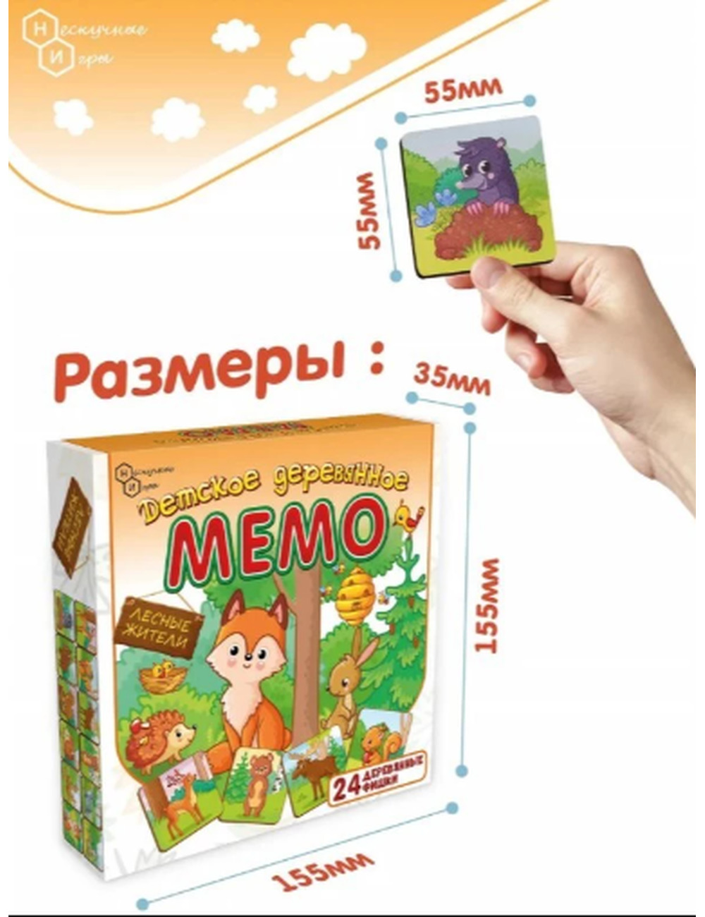 Мемо для малышей — это отличный способ познакомить ребёнка с животным миром леса через игру. В набор входят 24 деревянные карточки с изображениями лесных жителей — лисички, зайчики, ёжики, совы и других животных, которые часто встречаются в сказках и природе. Зачем они нужны? Малыш учится искать одинаковые пары, запоминать положение карточек, развивая при этом концентрацию и зрительную память.