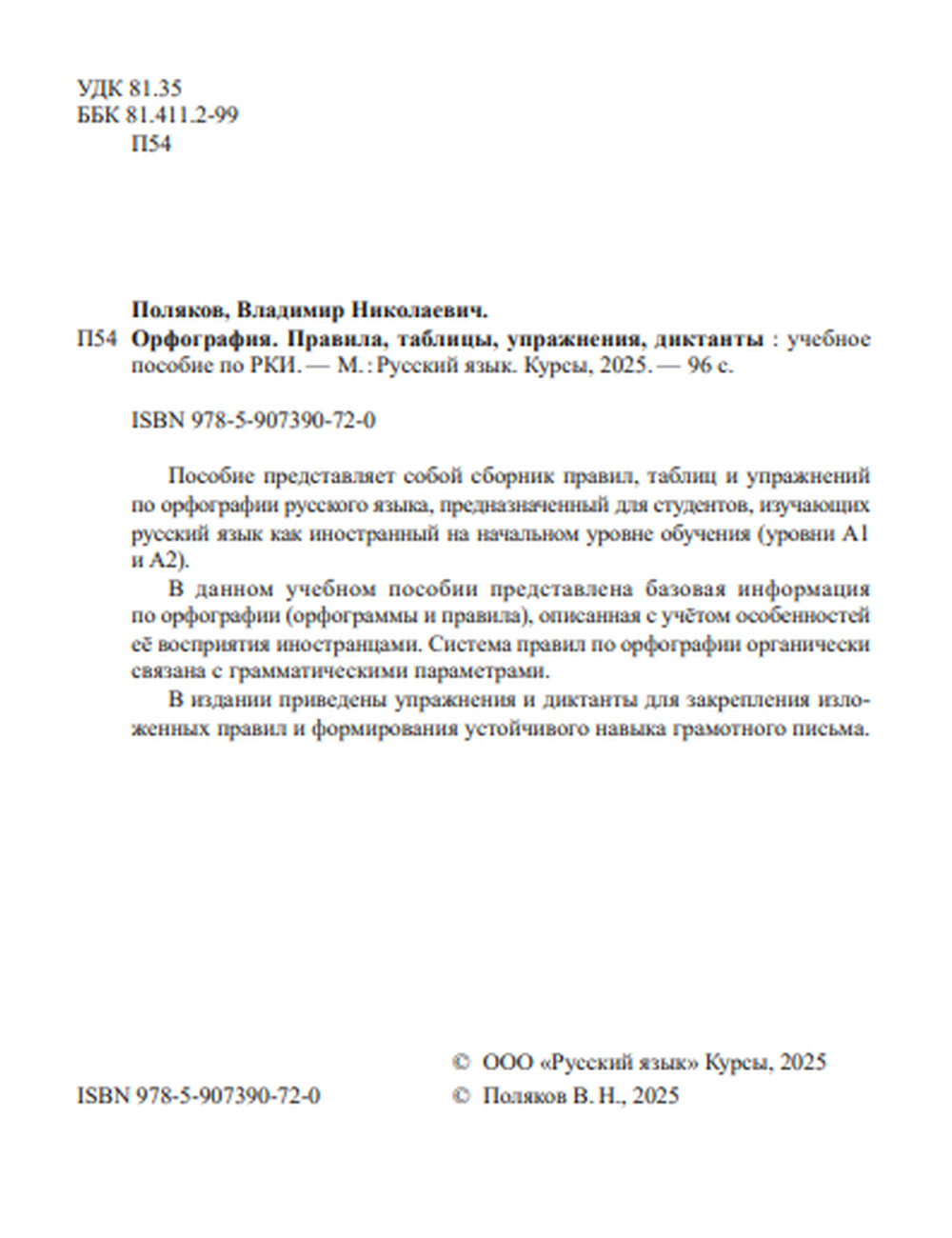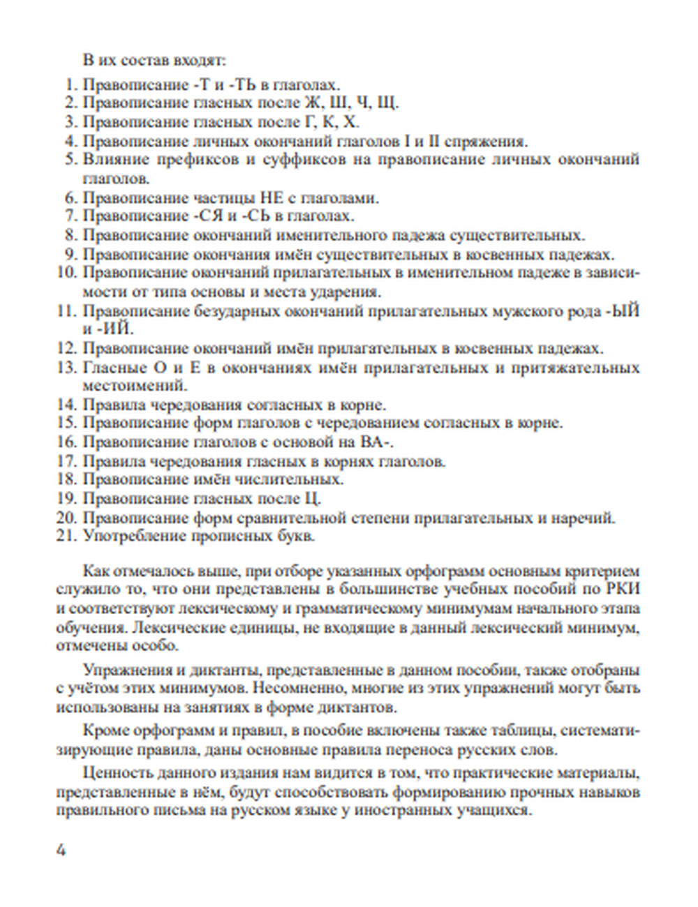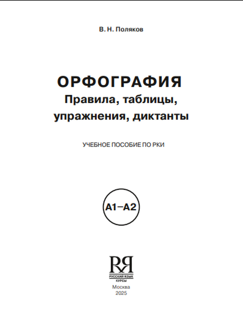 Пособие представляет собой сборник правил, таблиц и упражнений по орфографии русского языка, предназначенный для студентов, изучающих русский язык как иностранный на начальном уровне обучения (уровни А1 и А2).