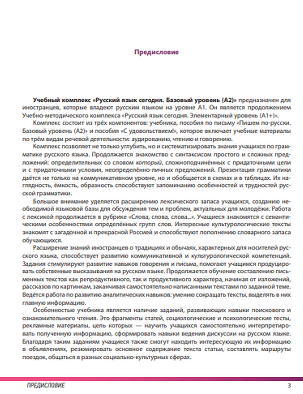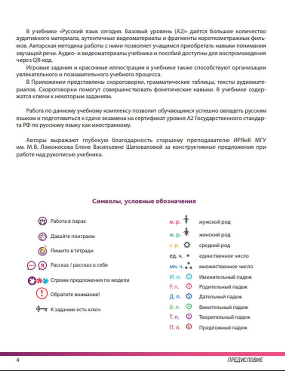 Учебник является главным компонентом учебного комплекса по русскому языку как иностранному «Русский язык сегодня. Базовый уровень (А2)» и предназначен для взрослых учащихся, продолжающих изучать русский язык. Это коммуникативно ориентированный курс, дающий возможность за короткий срок улучшить владение русским языком, параллельно повторяя и закрепляя пройденные на элементарном уровне темы. Материалы учебника способствуют развитию как диалогической, так и монологической речи, помогают более свободно выражать свои мысли в письменной форме, развивают навыки аудирования, а также изучающего, ознакомительного и поискового чтения.