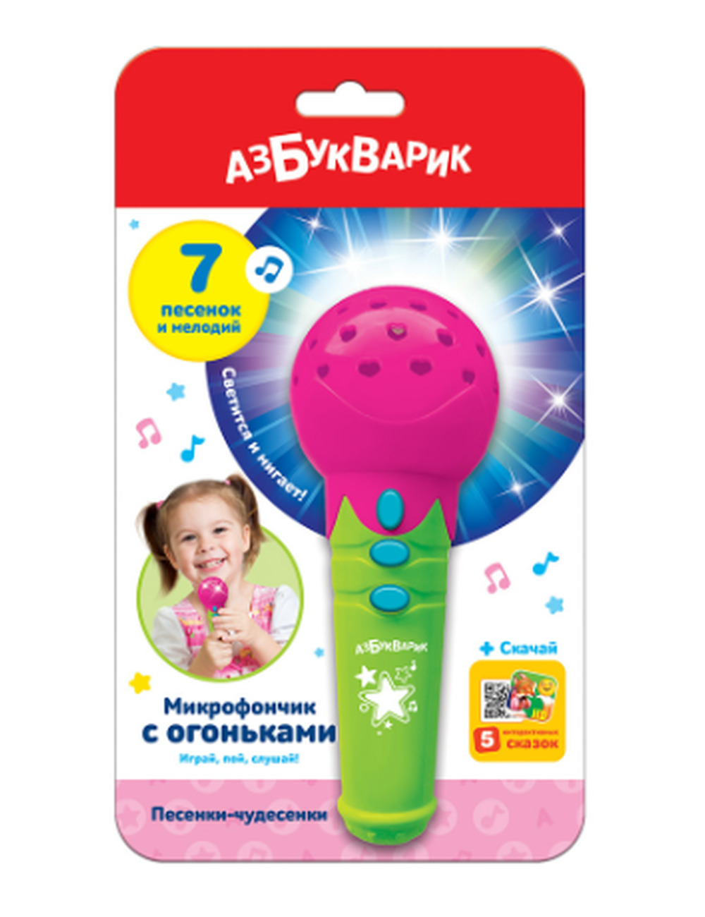 Яркий микрофончик порадует малышей любимыми песенками и веселыми огоньками! Нажимай на кнопочки – слушай детские хиты («Чунга-чанга», «Четыре таракана и сверчок»), забавные потешки («Дождик», «Щенок», «Лошадка»), зажигательные мелодии («Калинка», «Частушки»). Подпевай и танцуй, а микрофончик будет светиться под музыку!