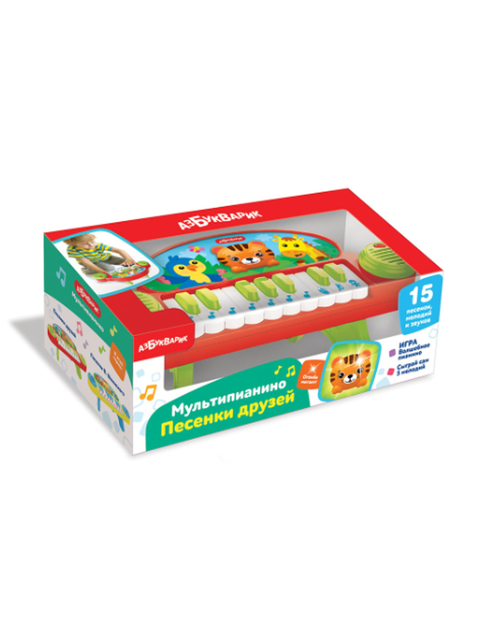 Мультипианино перенесёт вашего малыша в удивительный мир музыки! Пианино украшает яркая наклейка с милыми героями песен, а главный персонаж в центре порадует малыша веселыми огоньками, которые мигают под музыку. У игрушки есть удобная подставка в виде трех ножек.