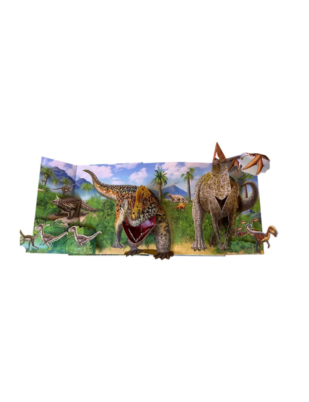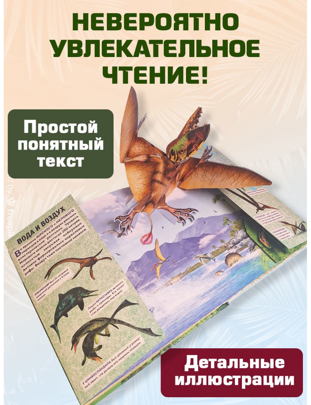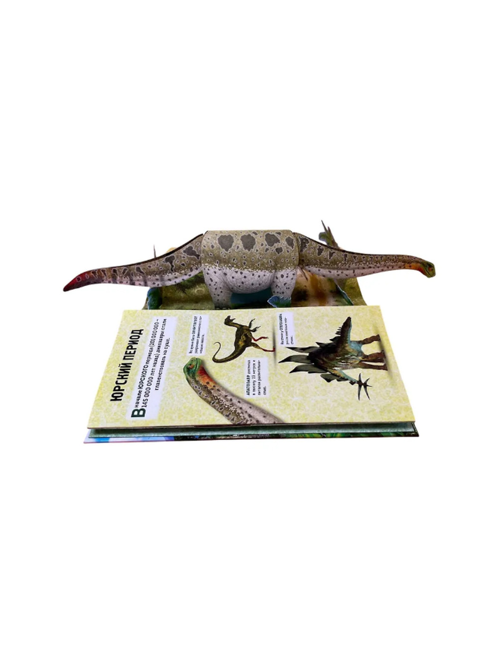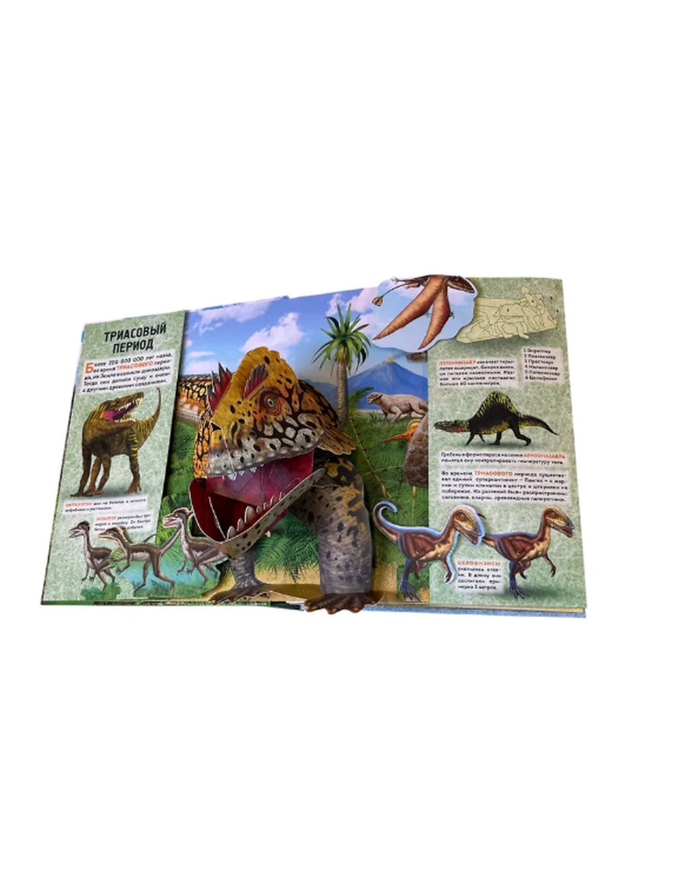 Каждый разворот — отдельный уголок древней Земли, в котором обитают гигантские ящеры. Объемные фигуры динозавров, подвижные элементы и боковые клапаны показывают, как жили динозавры в разные периоды, чем питались, как охотились и защищались.