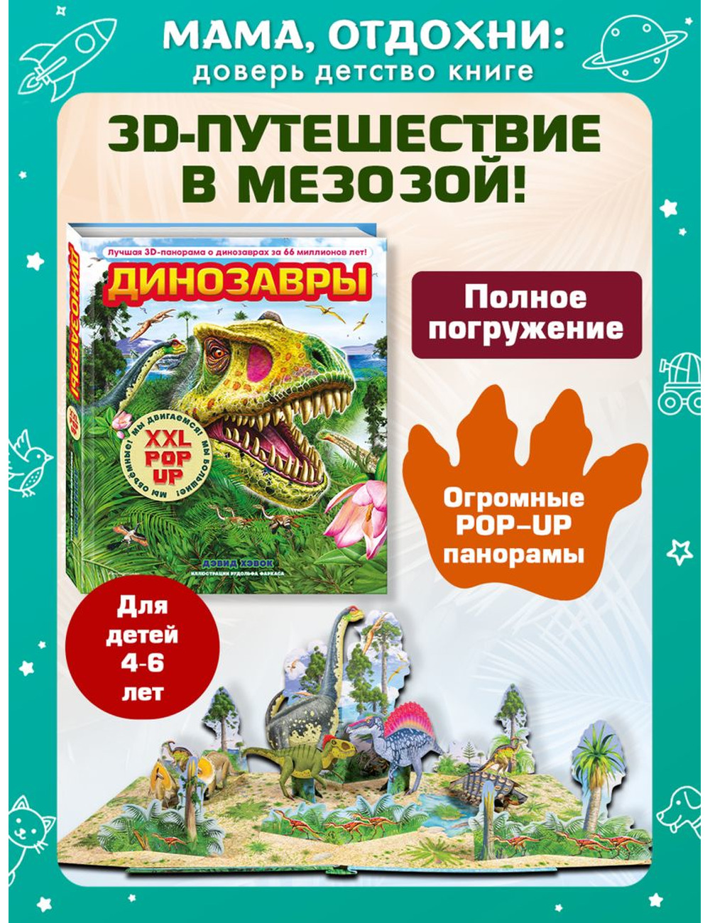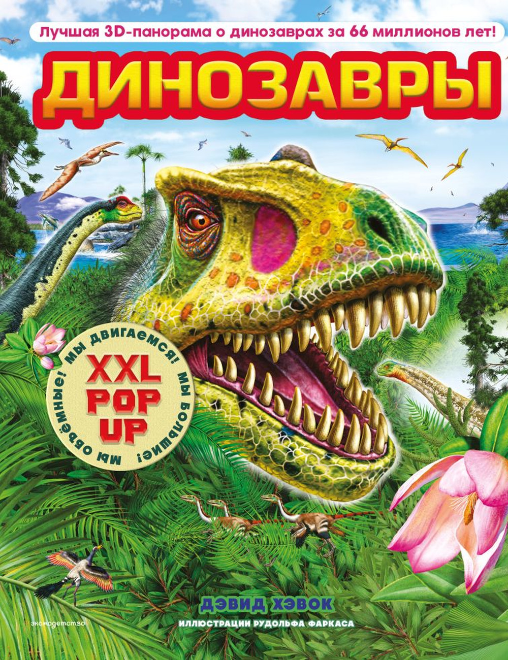 Внутри — 34 вида динозавров и 39 объемных pop-up фигур, которые встают навстречу читателю при открывании страниц и боковых клапанов. Реалистичные иллюстрации венгерского художника Рудольфа Фаркаса делают издание по-настоящему эффектным и запоминающимся.
