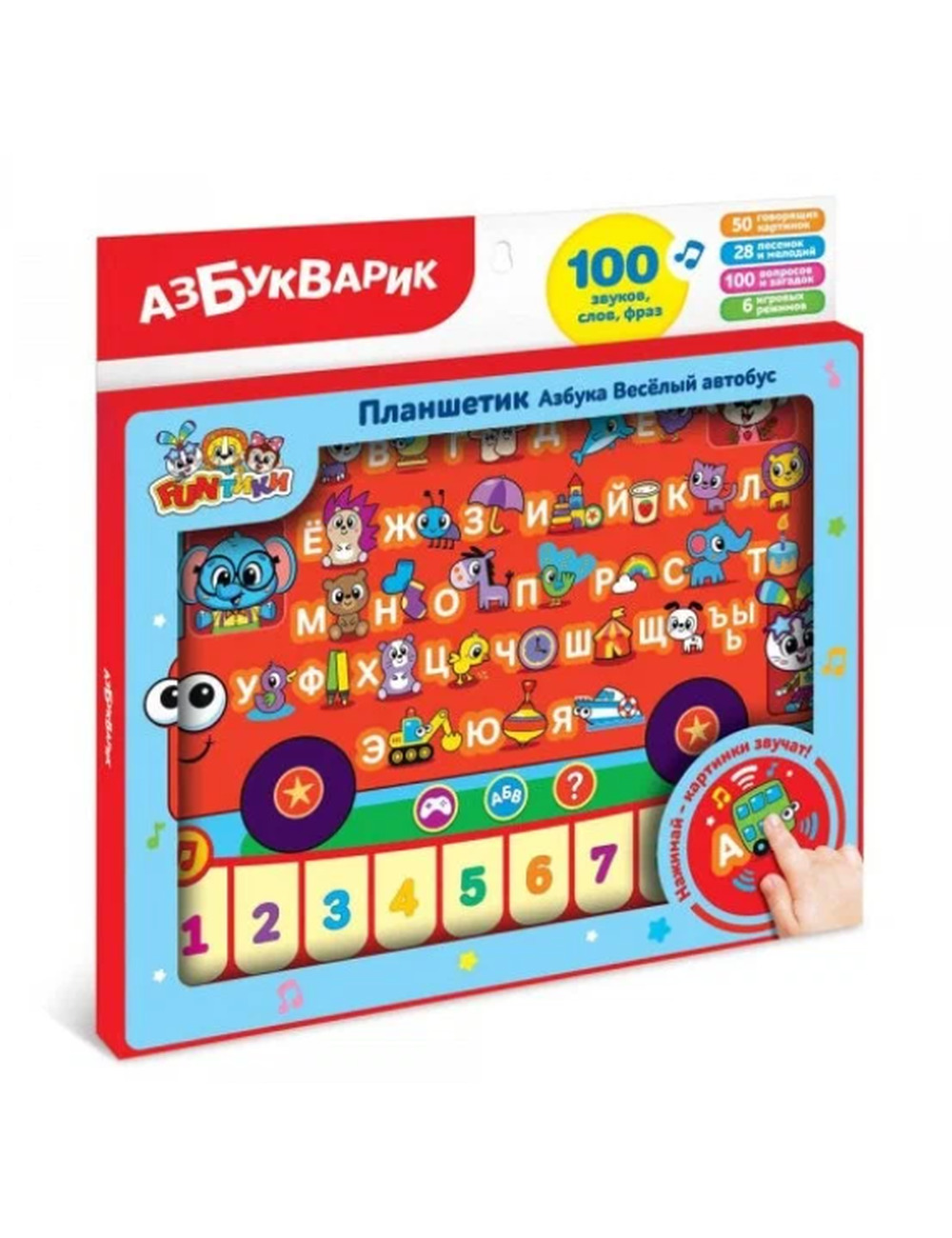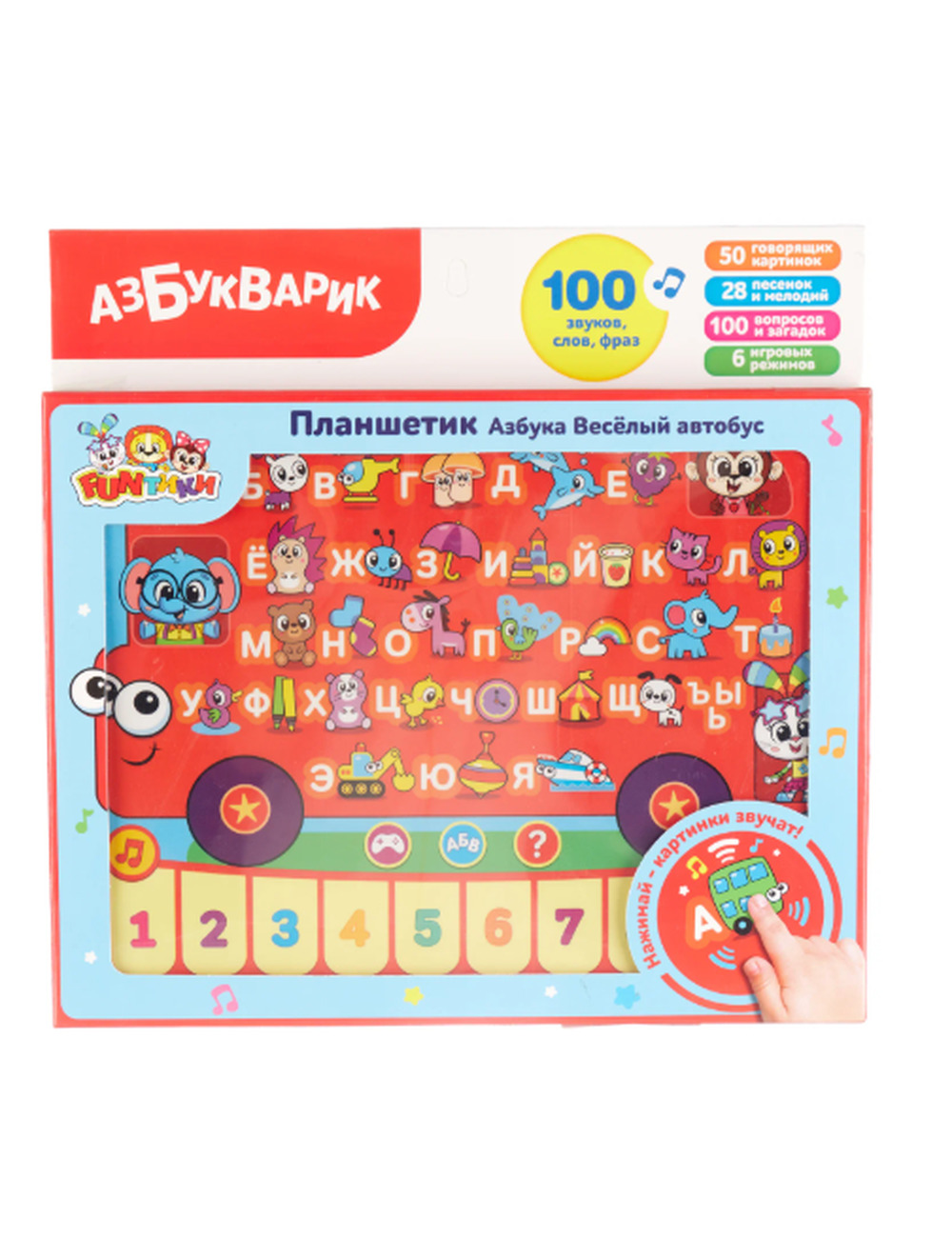 На планшете изображено 50 говорящих картинок, по которым непоседа изучает алфавит в режиме «Буквы, звуки и слова». Чтобы занятия доставили еще больше удовольствия, можно включить 100 вопросов и загадки в стихах.