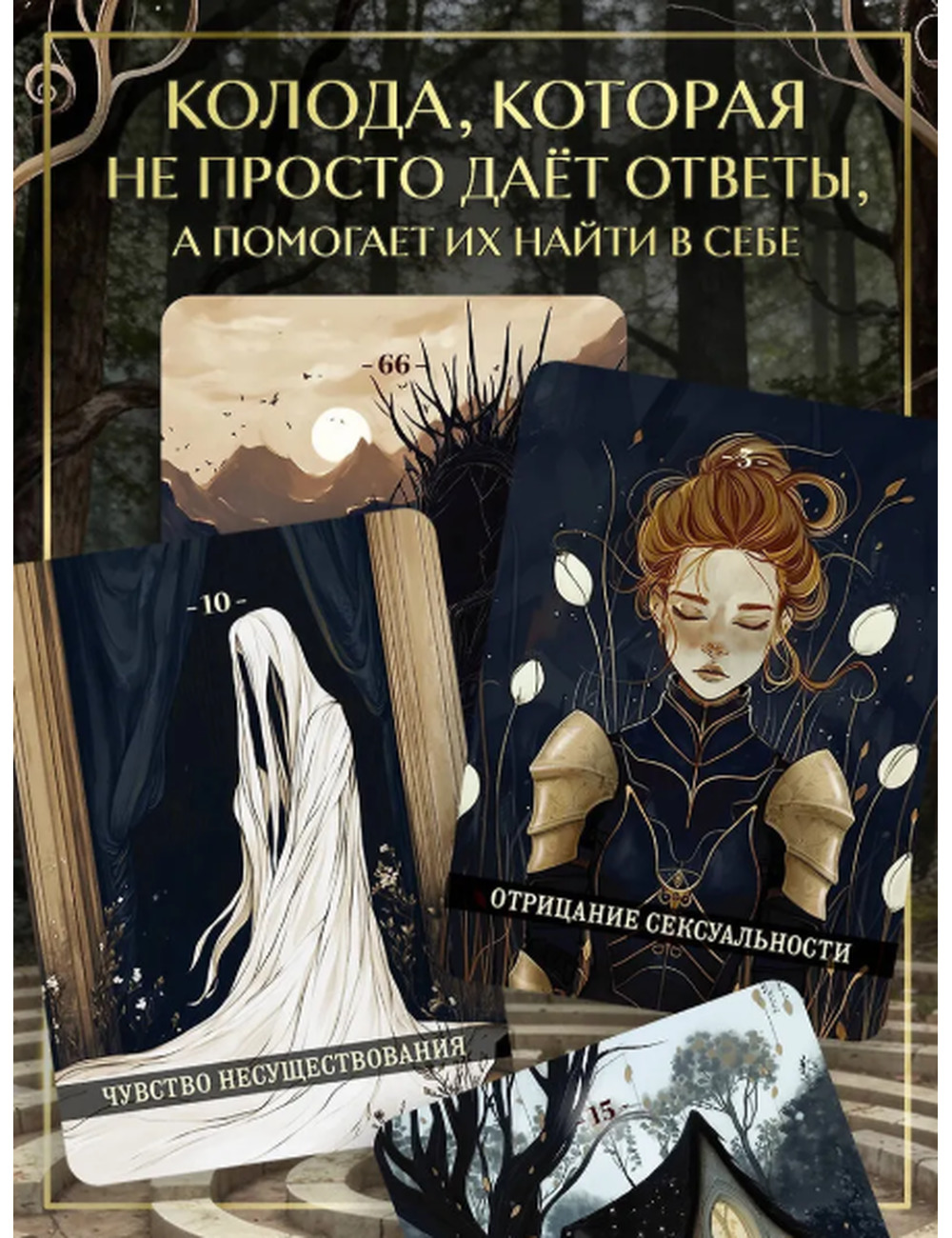 Каждая карта — это отражение архетипических образов и эмоций, понятных вашей психике на глубинном уровне. Колода подходит для самостоятельной рефлексии, работы с психологом, творческих или медитативных практик. Образы карт побуждают задавать вопросы, распознавать сложные чувства и открывать смыслы, которые остаются скрытыми в повседневной жизни.