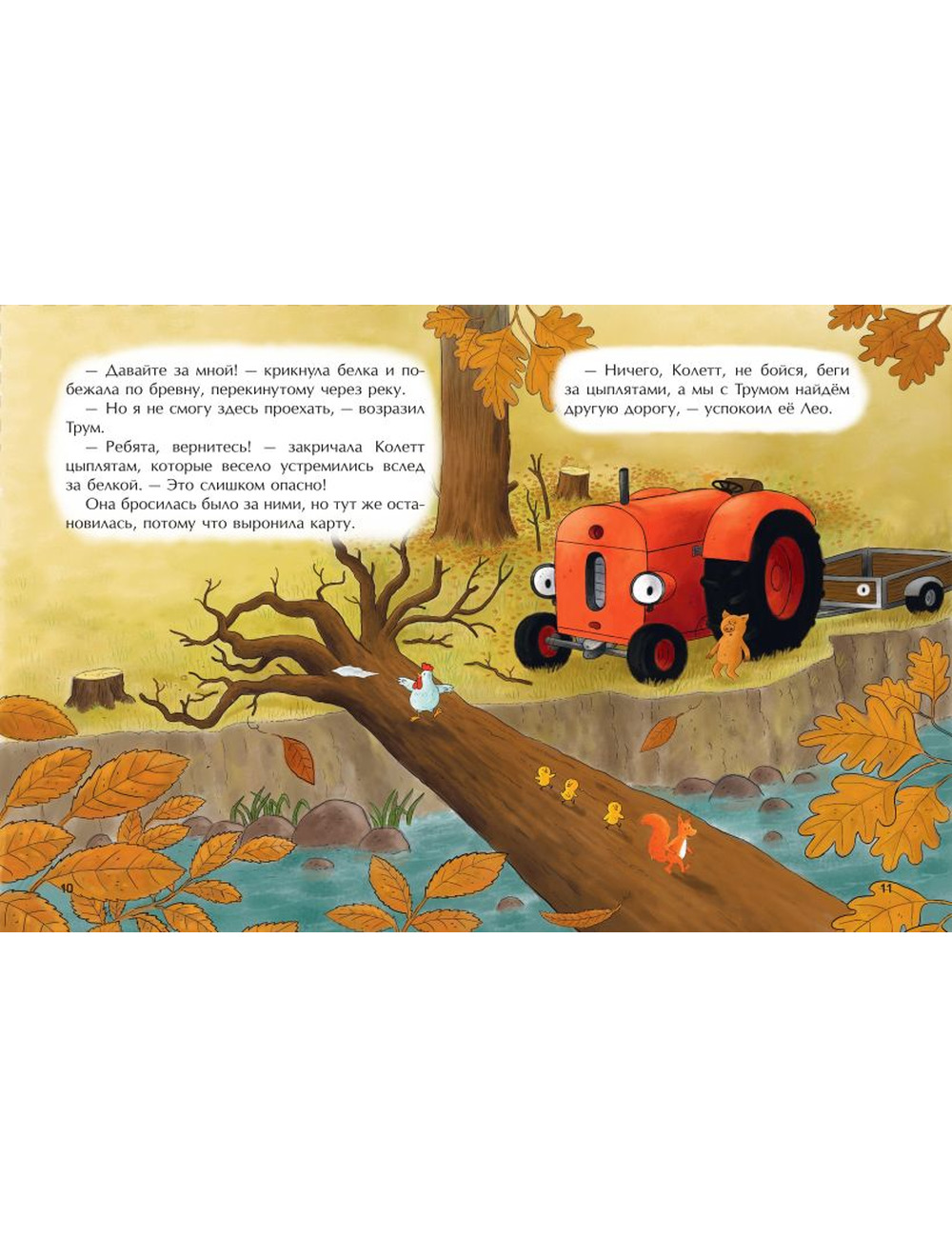 В этой тёплой и доброй истории маленький Трактор Трум впервые отправляется в большое осеннее путешествие за пределы родной фермы. Вместе с друзьями он преодолевает трудности, заводит дружбу с жителями леса, учится не бояться нового — и вдруг замечает, что осень, которую он раньше не любил, на самом деле полна красоты и удивительных открытий.