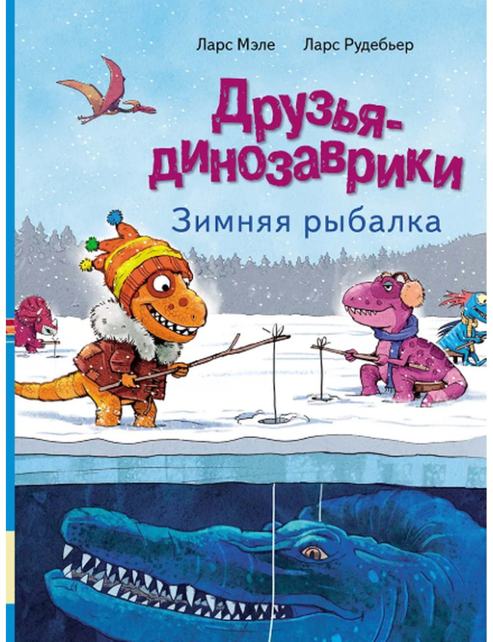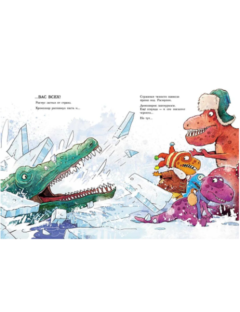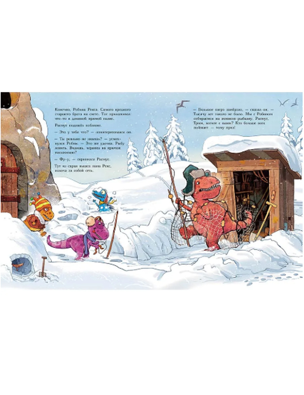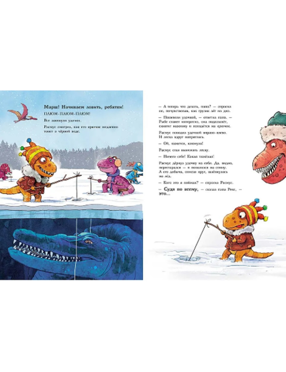 Ранним субботним утром Трим разбудил Расмуса и потащил на улицу. А там впервые за тысячу лет выпал снег! Такого динозаврикам еще видеть не приходилось. Папа Рекс предложил устроить соревнования по зимней рыбалке, и веселая компания отправилась на Большое озеро. Но оказалось, что ловить рыбу подо льдом совсем непросто, и на крючок постоянно попадалось что-то не то. А потом и вовсе попался кронозавр - самое кровожадное подводное чудище на свете! И неизвестно, чем бы это закончилось, если бы не бабушка Рекс, которая бросилась на защиту любимого внука и обратила в бегство грозного кронозавра. Cерию о друзьях-динозавриках сочинили и нарисовали писатель Ларс Мэле и художник Ларс Рудебьер. Они создали целую страну Динозаврию, где на каждой странице ребенка ждет что-то смешное. Книга отлично подойдет для чтения вслух и разыгрывания по ролям с детьми от 4-х лет. А познавательная часть познакомит малышей с настоящими динозаврами - прототипами героев книги.