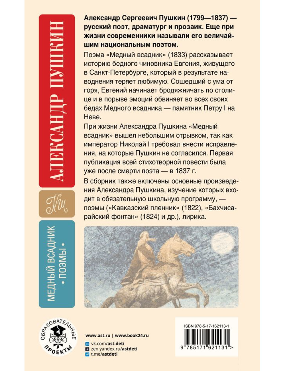 При жизни Александра Пушкина "Медный всадник" вышел небольшим отрывком, так как император Николай I требовал внести исправления, на которые Пушкин не согласился. Первая публикация всей стихотворной повести была уже после смерти поэта – в 1837 году. В сборник также вошли основные произведения Александра Пушкина,изучение которых входит в обязательную школьную программу, – поэмы ("Кавказский пленник" (1822), "Бахчисарайский фонтан" (1824) и др.), лирика.