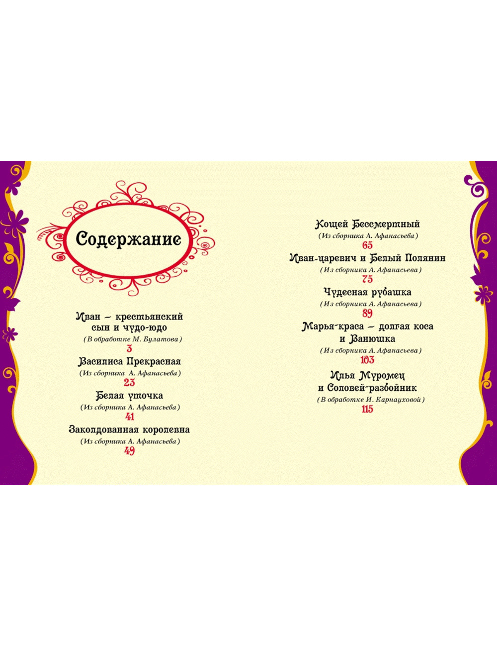 В сборник вошли русские волшебные сказки: «Василиса Прекрасная», «Белая уточка», «Заколдованная королевна», «Кощей Бессмертный», «Илья Муромец» и «Соловей-разбойник» и др. Тексты в обработке А. Афанасьева, И. Карнауховой и М. Булатова. Яркие иллюстрации на каждой странице.