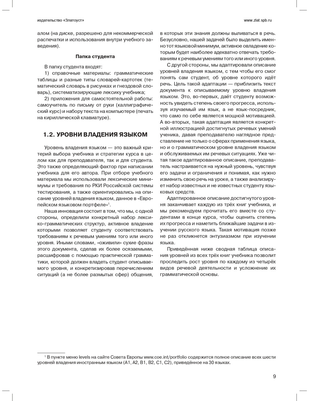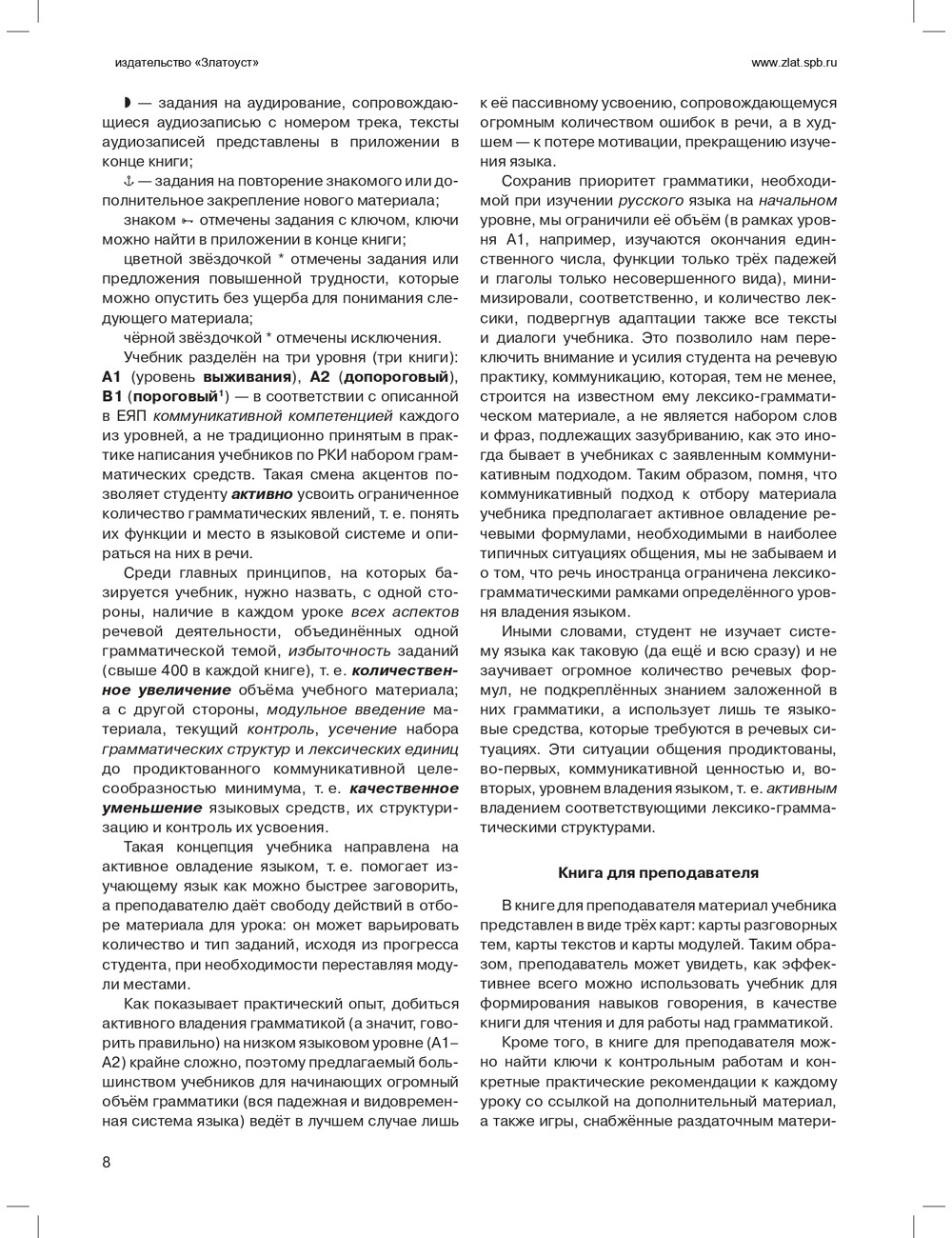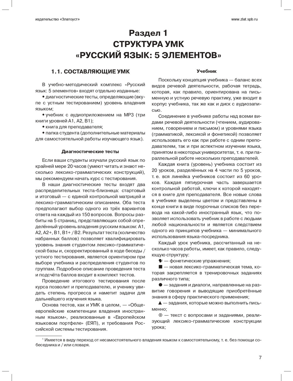 Данное издание является частью учебно-методического комплекса «Русский язык: 5 элементов» и представляет собой книгу для преподавателя к учебнику уровня А1 (элементарного). В книге содержатся методические рекомендации по работе с комплексом, поурочные комментарии к учебнику, а также диск с многочисленными дополнительными материалами (играми, рисунками, интервью, контрольными карточками, каталогом ситуаций, грамматическим тренажёром). Материалы диска разрешены для некоммерческой распечатки и использования внутри учебного заведения.