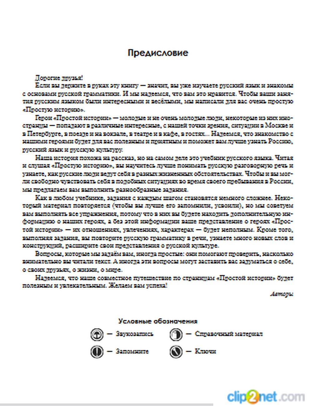 «Простая история» — это не только увлекательное чтение. Работая с этой книгой, можно обогатить лексический запас, повторить русскую грамматику, развить навыки разговорной речи. Книга поможет больше узнать о России, русских людях, русской культуре. Пособие ориентировано в первую очередь на краткосрочный курс обучения (приблизительно 40 часов).