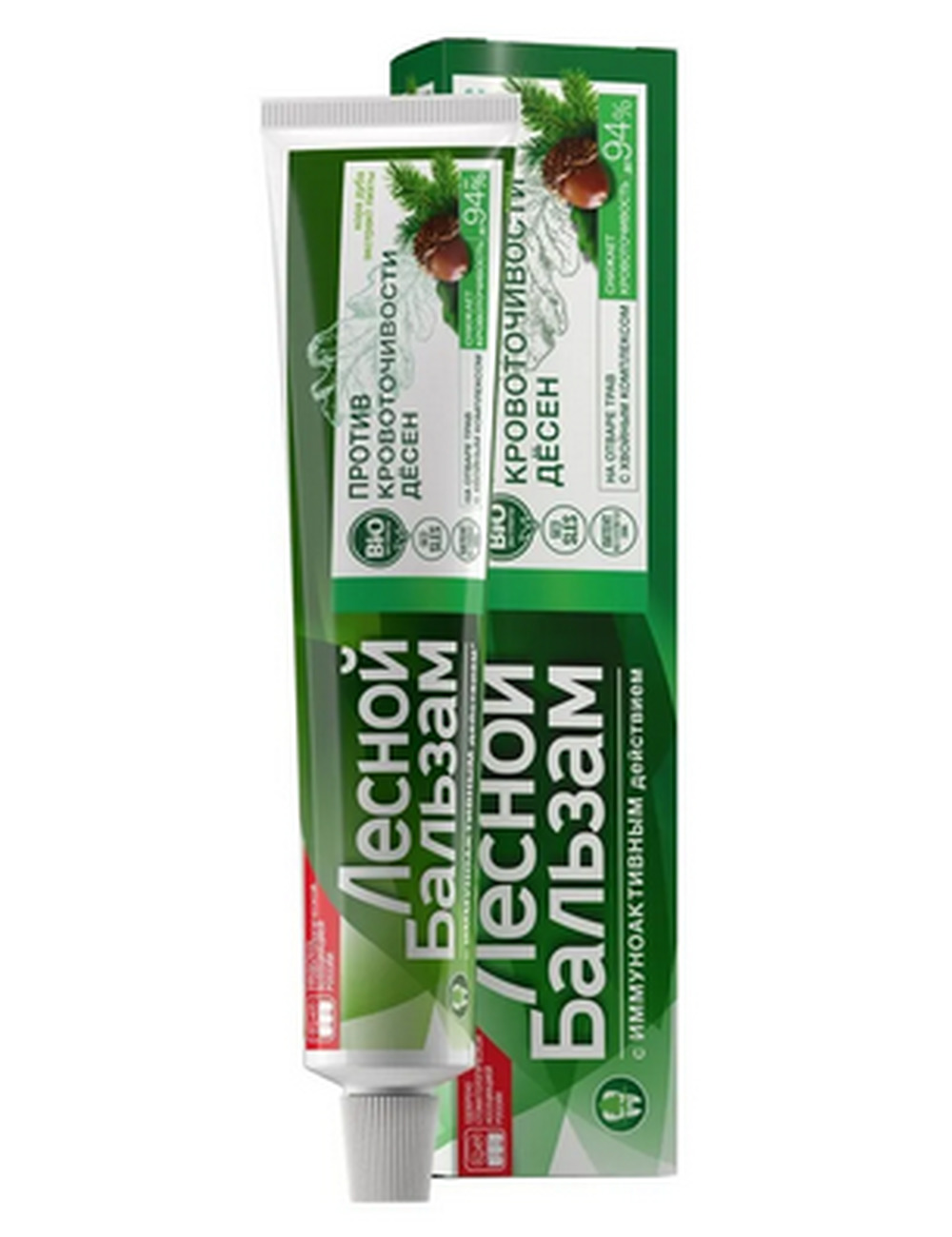 Состав: Aqua, Sorbitol, Silica, Sodium Lauryl Sulfate, Aroma, Cellulose Gum, Abies Sibirica Leaf Extract, Achillea Millefolium Extract, Chamomilla Recutita (Matricaria) Flower Extract, Chelidonium Majus Extract, Hypericum Perforatum Flower/Leaf/Stem Extract, Picea Leaf Extract, Polyprenol, Quercus Alba Bark Extract, Urtica Dioica (Nettle) Leaf Powder, Sodium Monofluorophosphate, Citric Acid, Glycerin, Phenoxyethanol, Sodium Benzoate, Sodium Chloride, Sodium Hydroxide, Sodium Saccharin, Sodium Sulfate, Eugenol, Limonene, CI 19140, CI 42090, CI 77891.