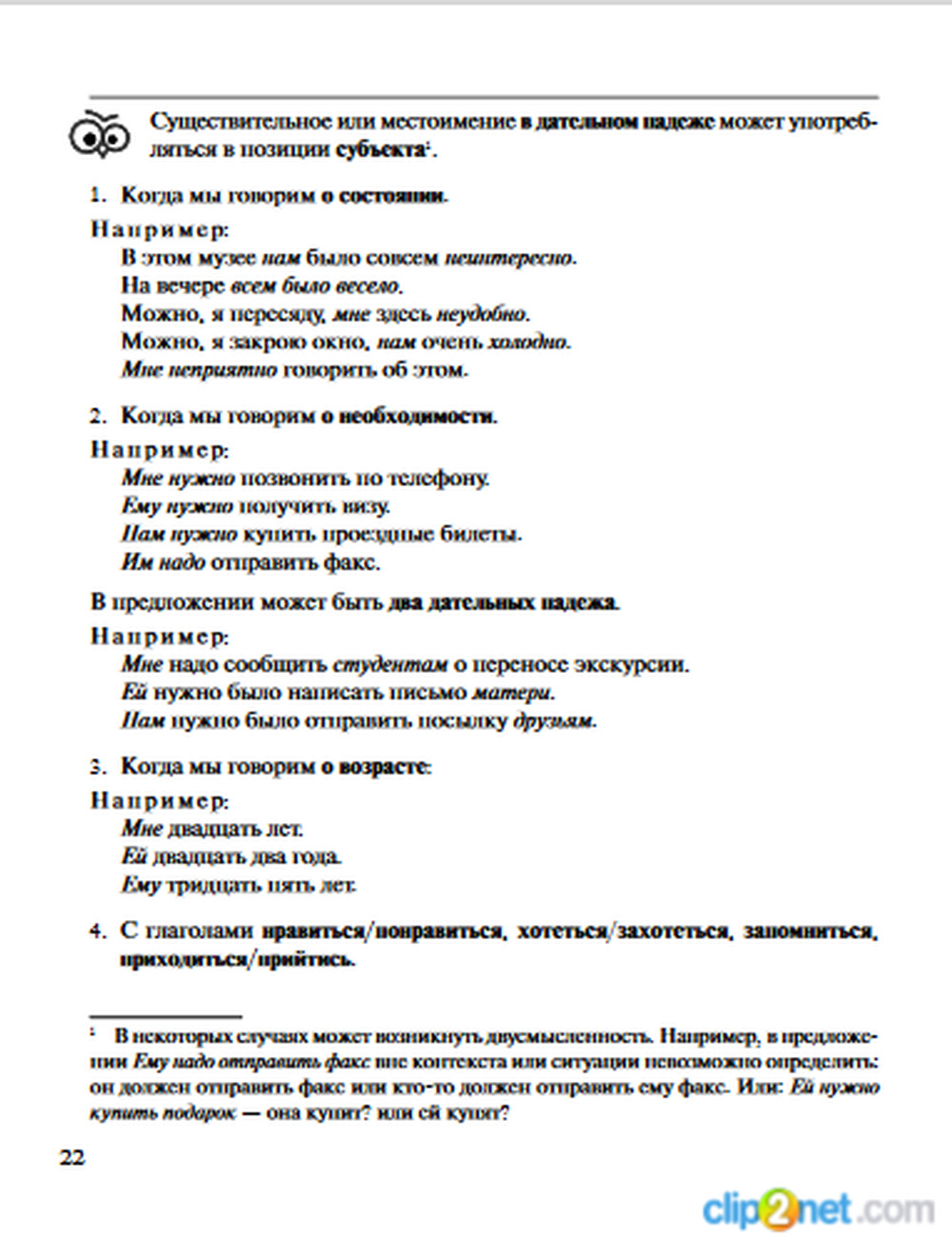Практикум состоит из двух частей. Первая часть представляет собой корректировочный курс по русской грамматике и охватывает падежные формы именных частей речи и систему глагола. Она включает в себя материал, рассчитанный на тех учащихся, которые знакомы с основами русской грамматики на уровне А2, имеют навыки устной речи, понимают и читают по-русски, но нуждаются в осмыслении грамматической системы русского языка и выработке автоматизма в употреблении форм. Вторая часть посвящена синтаксису простого и сложного предложения. Она рассчитана на тех, кто владеет русским языком на уровне В1, В2. При описании предложения авторами использован принцип «от смысла — к форме», который позволяет не только увидеть особенности русского синтаксиса, но и выполнять основную коммуникативную задачу говорящего — выражать смысловые связи между обозначаемыми событиями.