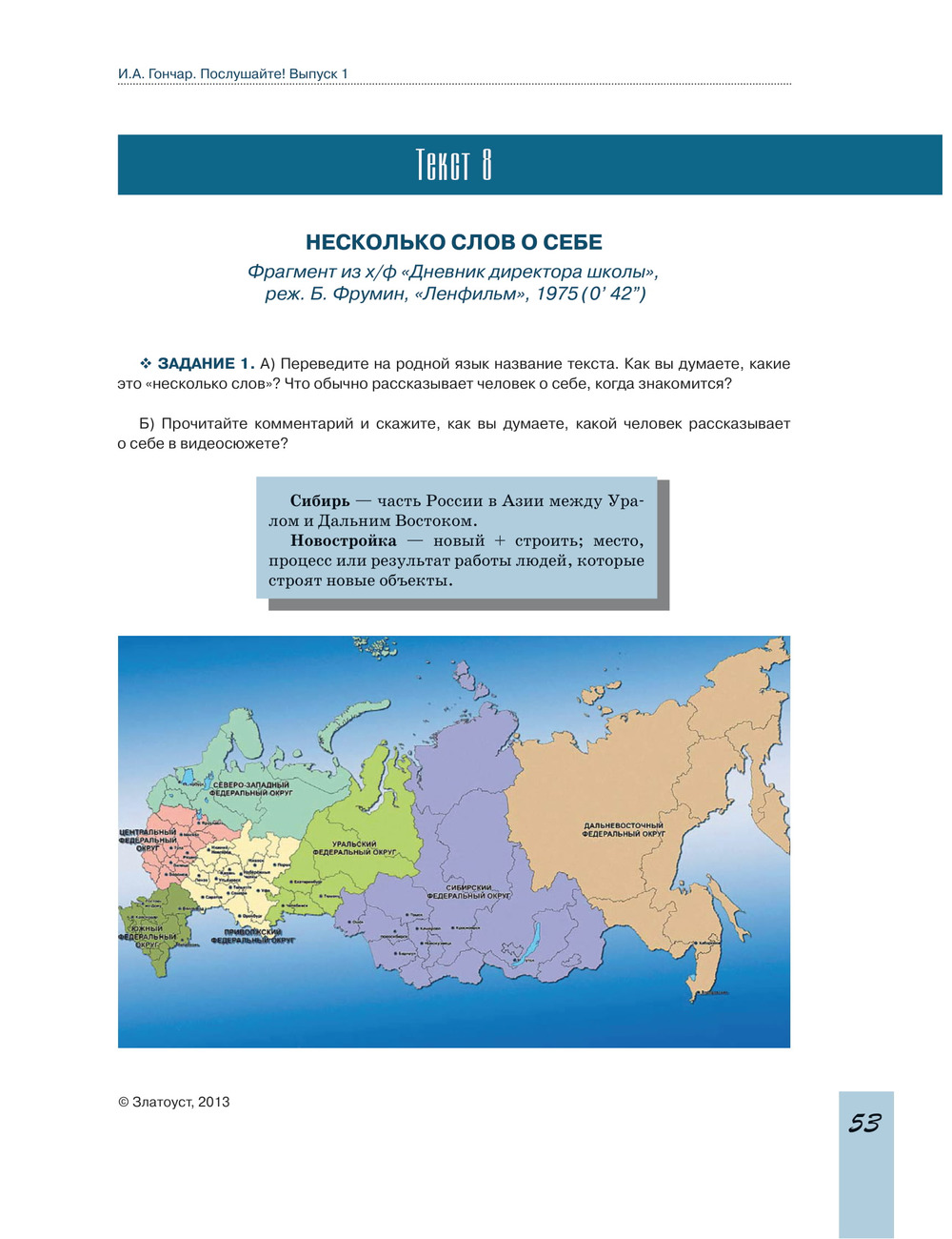 Учебный комплекс для иностранных учащихся по обучению аудированию на материале аутентичных текстов. Предназначен для уровней А1-В1 (элементарный, базовый и I сертификационный). В трех выпусках, каждый из которых включает DVD с видеозаписью и книгу с текстами, заданиями и ключами. Специально отобранные видеосюжеты способствуют формированию социокультурной и страноведческой компетенции.