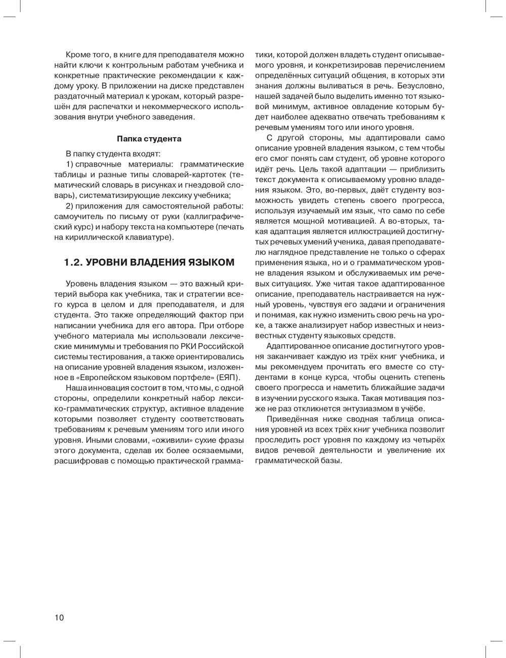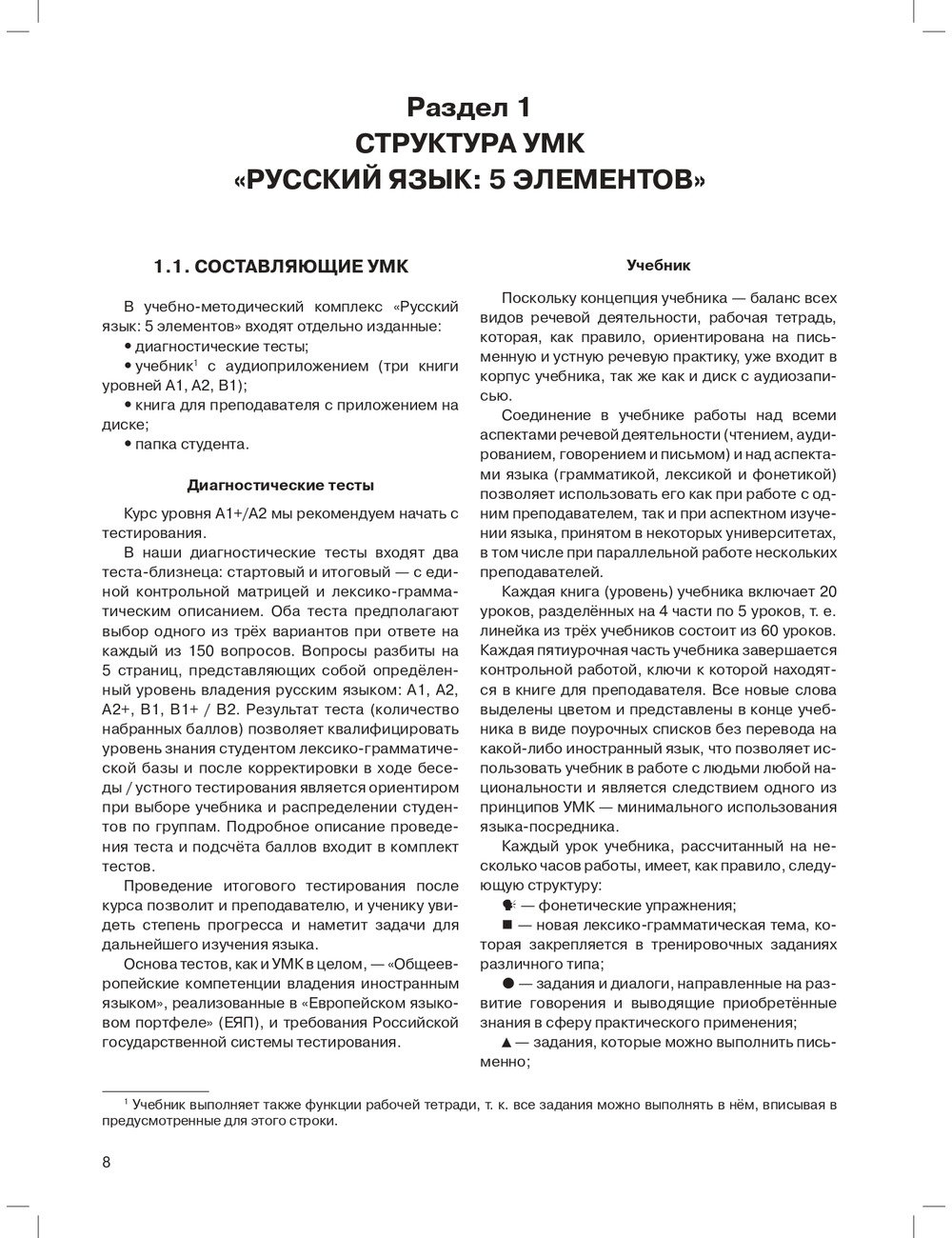 Данное издание является частью учебно-методического комплекса «Русский язык: 5 элементов» и представляет собой книгу для преподавателя к учебнику уровня А2(базового уровня). В книге содержатся методические рекомендации по работе с комплексом, поурочные комментарии к учебнику, а также диск с многочисленными дополнительными материалами (играми, рисунками, интервью, контрольными карточками, каталогом ситуаций, грамматическим тренажёром).
