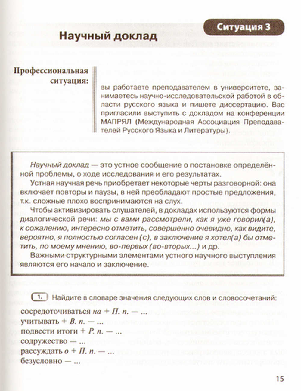 Предназначено для изучающих русский язык как иностранный и владеющих им на уровне C1. Пособие даёт представление о научном, официально-деловом и публицистическом стилях современного русского языка. Цель пособия — научить распознаванию и правильному использованию стилей в различных коммуникативных ситуациях. Особенность данного пособия состоит в том, что в нём обозначены профессиональные ситуации, с которыми иностранные учащиеся столкнутся в России и при общении с российскими коллегами. Каждый раздел содержит теоретическую часть — общую информацию o конкретном стиле русского языка, и практическую часть, в которой показано соотношение стиля с профессиональными ситуациями. В практическую часть входят задания, направленные на развитие коммуникативных и межкультурных навыков и умений учащихся в профессиональном общении. Разделы носят модульный характер и предполагают любую последовательность их включения в учебный процесс.
