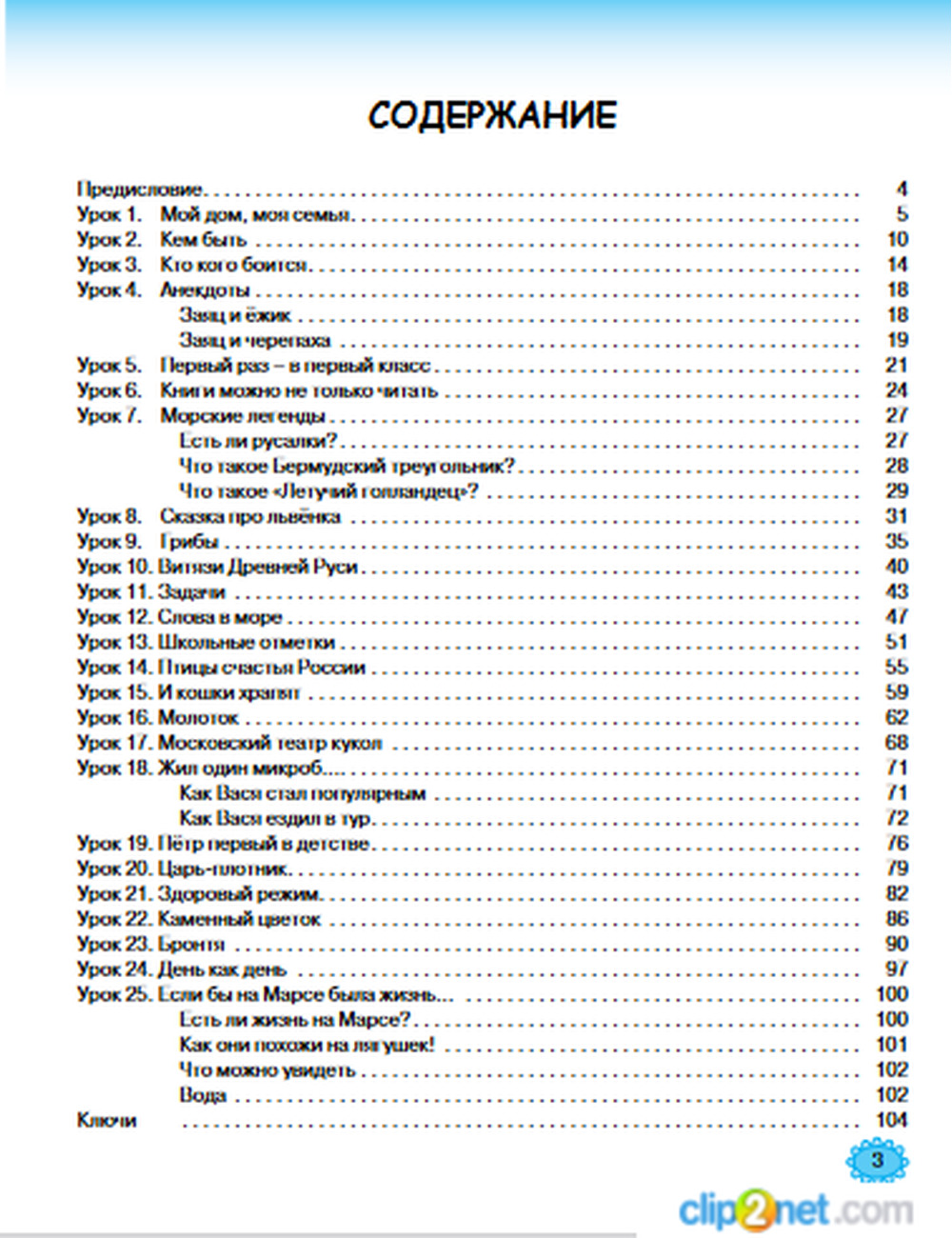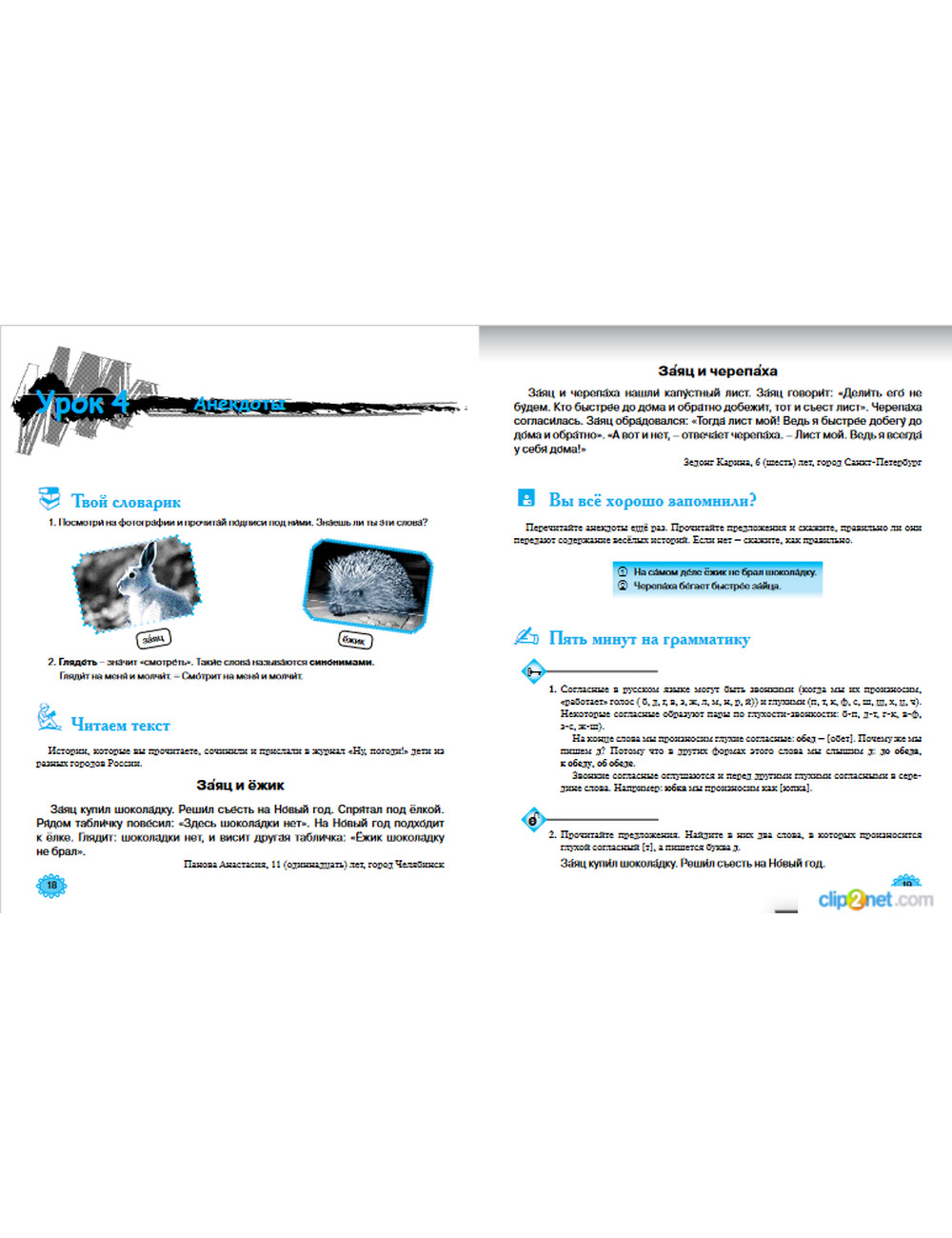 Из урока в урок повторяются задания на безударные гласные, проверяемые ударением, на непроизносимые согласные, словарные слова, мягкий знак в различных частях речи и правописание личных окончаний глаголов. Упражнения опираются на материал текста, в конце книги есть ключи.
