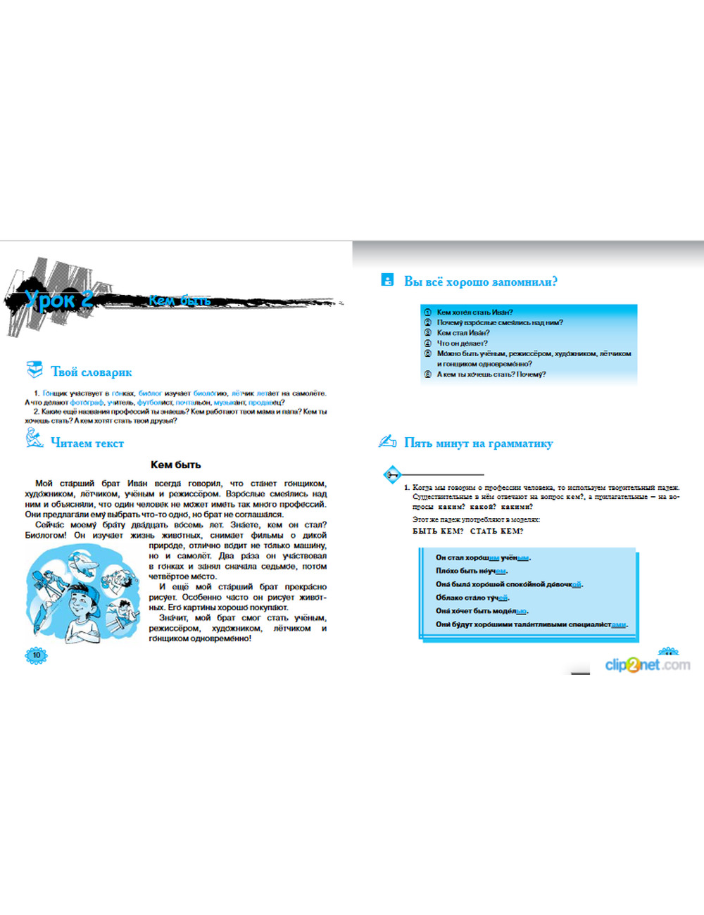 Это пособие по чтению и письму, в нём 40 уроков, в каждом уроке — текст и задания на понимание, грамматику и правописание.