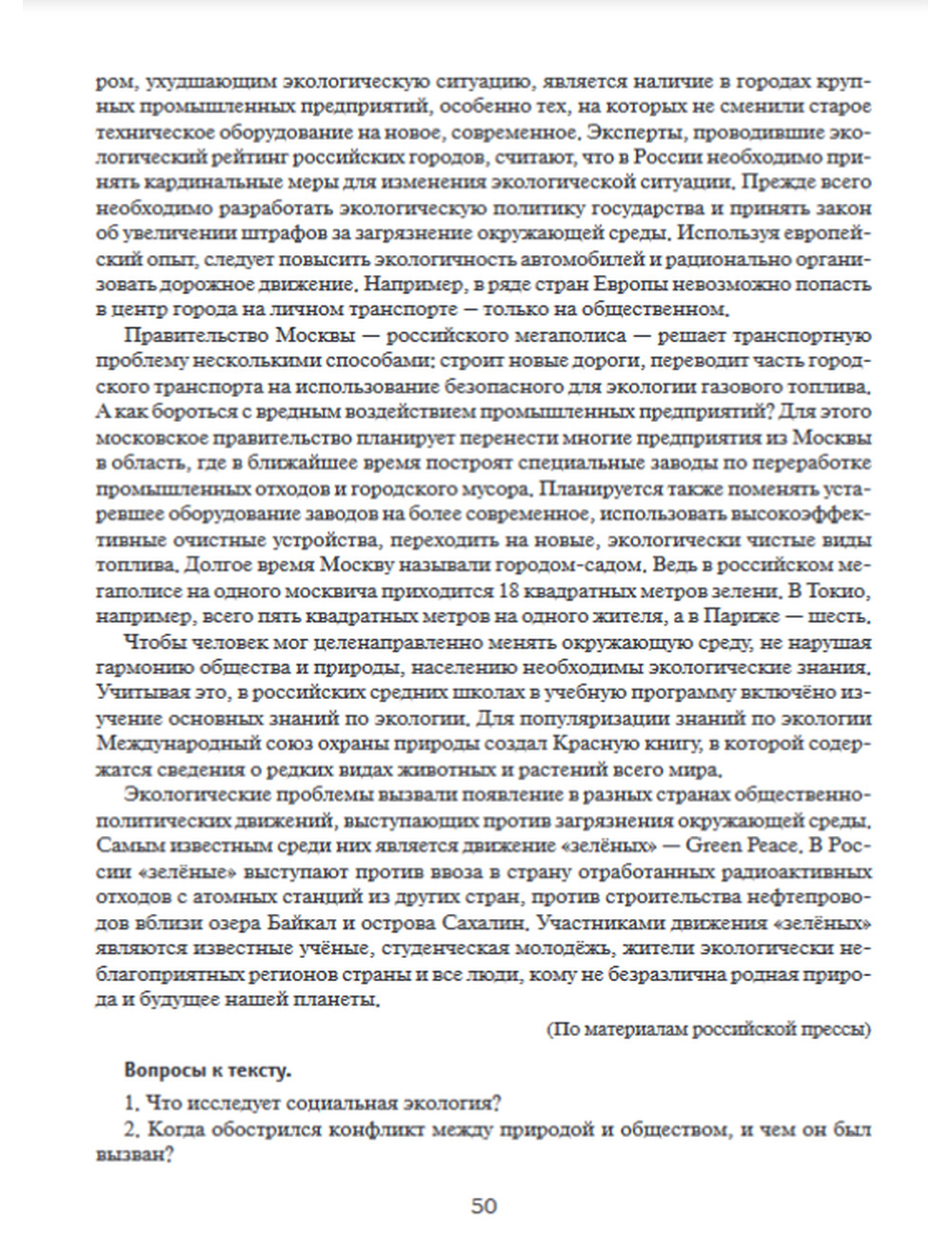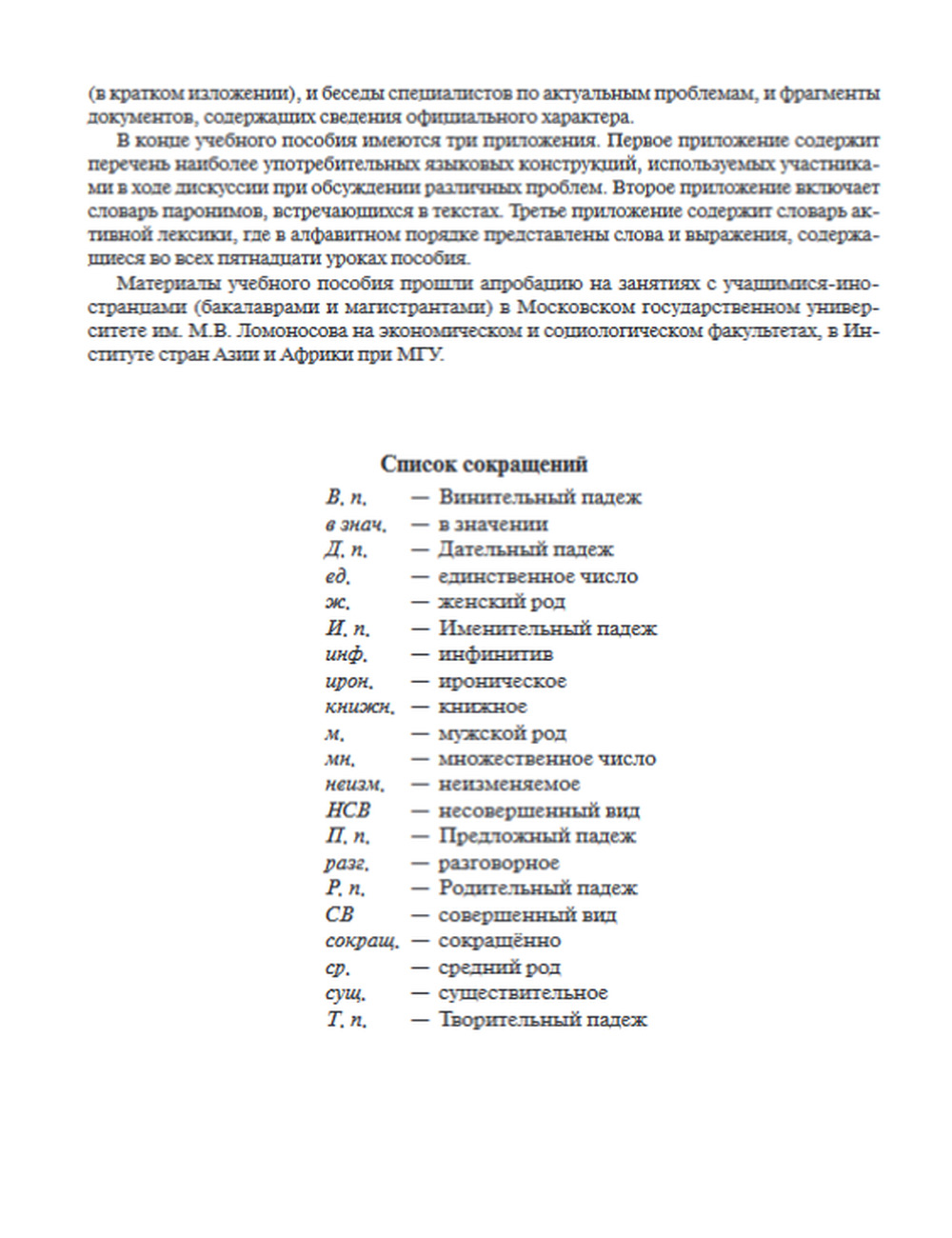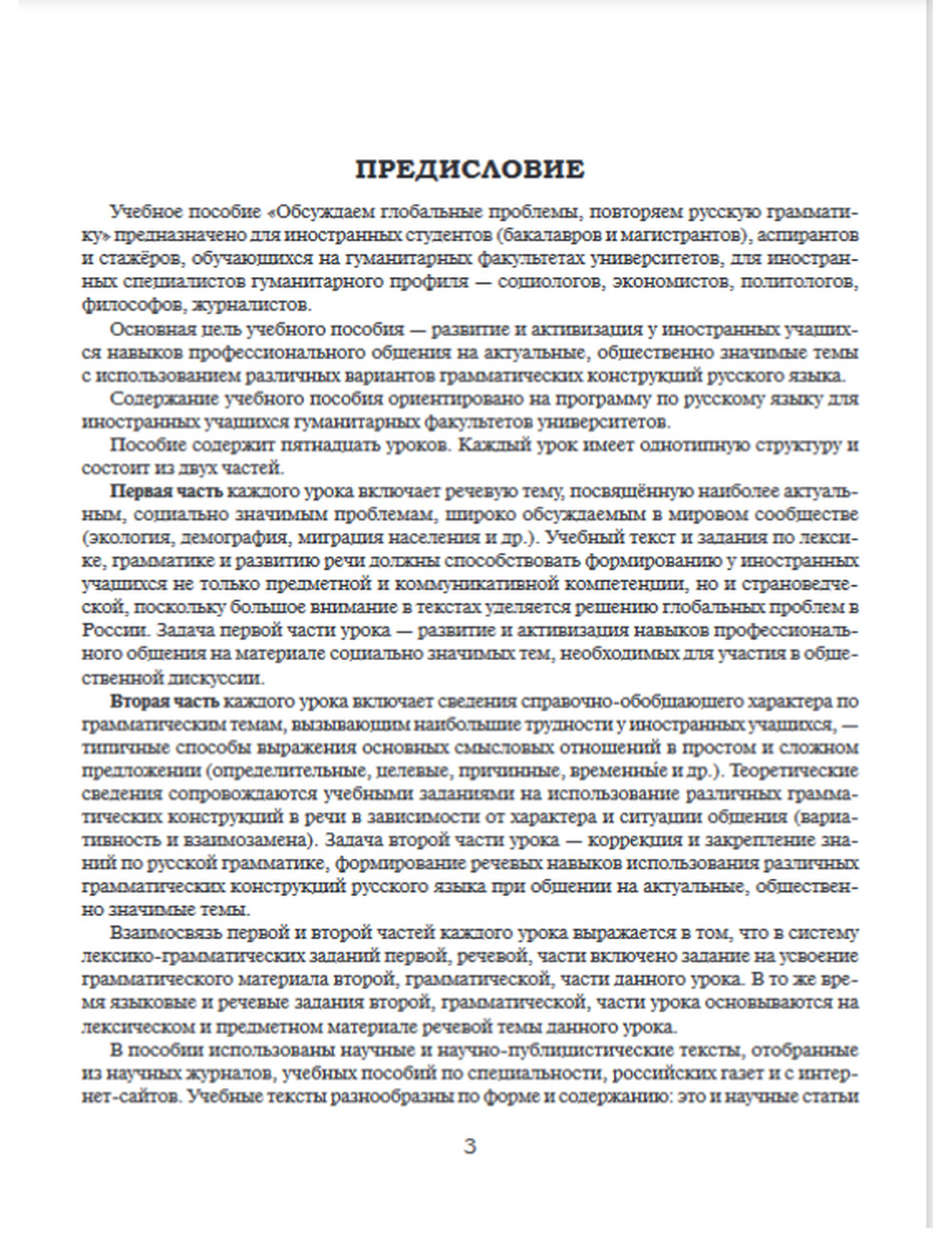 Основная цель учебного пособия — развитие и активизация у иностранных учащихся навыков профессионального общения на актуальные, общественно значимые темы с использованием различных вариантов грамматических конструкций русского языка. В каждом из 14 уроков пособия содержатся тексты по глобальным проблемам современности, задания по лексике, грамматике, развитию речи (устной и письменной), а также обобщённый теоретический материал по наиболее трудным для иностранцев грамматическим темам и задания на его усвоение и активизацию в речи. Подбор, содержание и организация учебного материала направлены на формирование у иностранных учащихся предметной, страноведческой и коммуникативной компетенции на русском языке, на умение участвовать в общественной дискуссии по актуальным проблемам со временности. Пособие предназначено для иностранных студентов (бакалавров и магистрантов), аспирантов и стажёров, обучающихся на гуманитарных факультетах университетов, для иностранных специалистов гуманитарного профиля — социологов, экономистов, журналистов, политологов, философов и др.