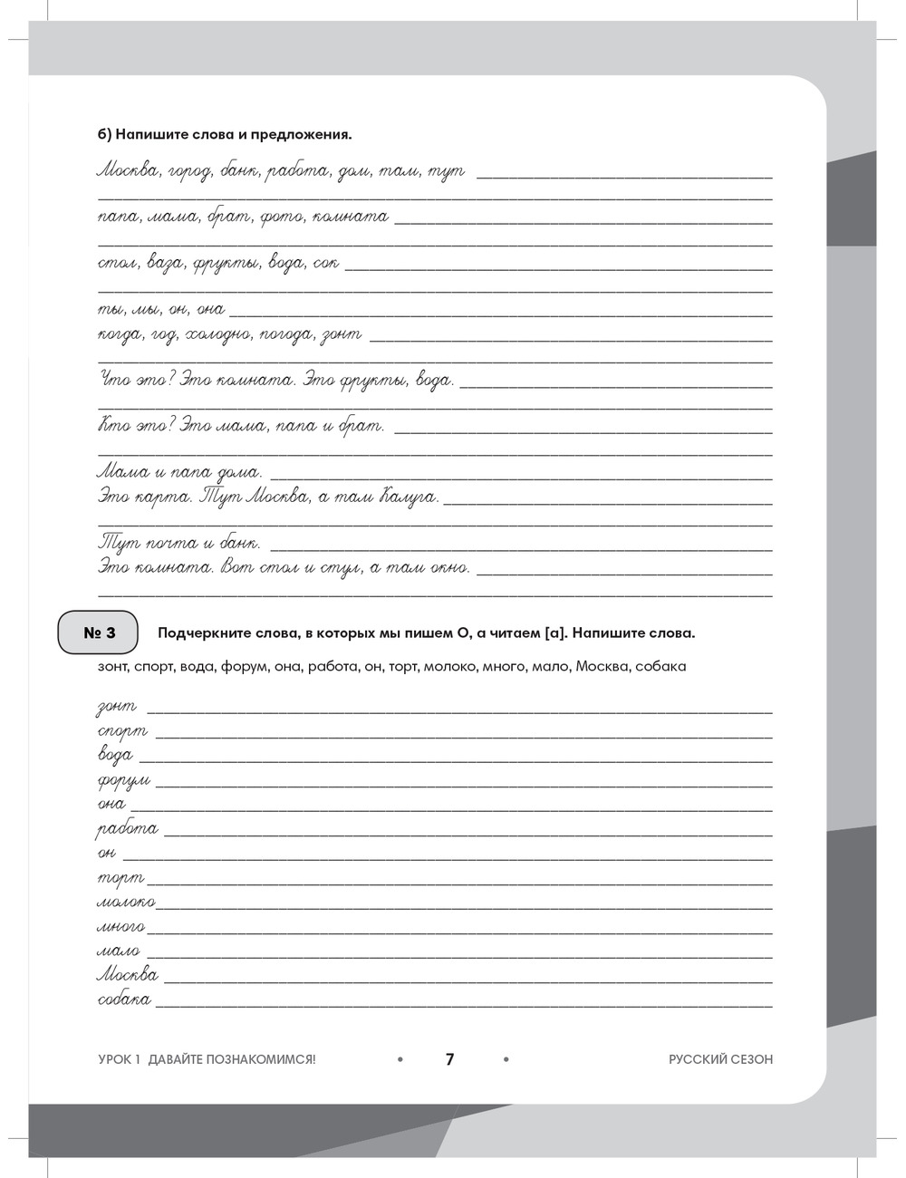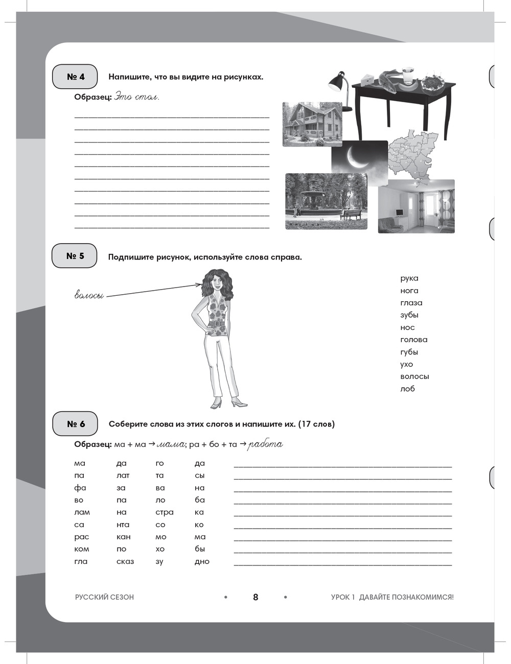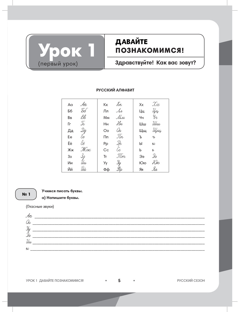 Рабочая тетрадь является частью учебного комплекса «Русский сезон» (элементарный уровень, А1+) и адресована иностранцам, начинающим изучать русский язык. В тетради содержатся упражнения, тексты, диалоги, которые предназначены для тренировки и закрепления грамматических навыков и умений, для повторения и отработки лексического материала, а также тексты популярных песен, поурочные и общий алфавитный словники.