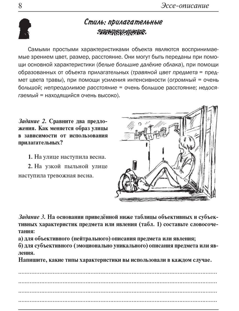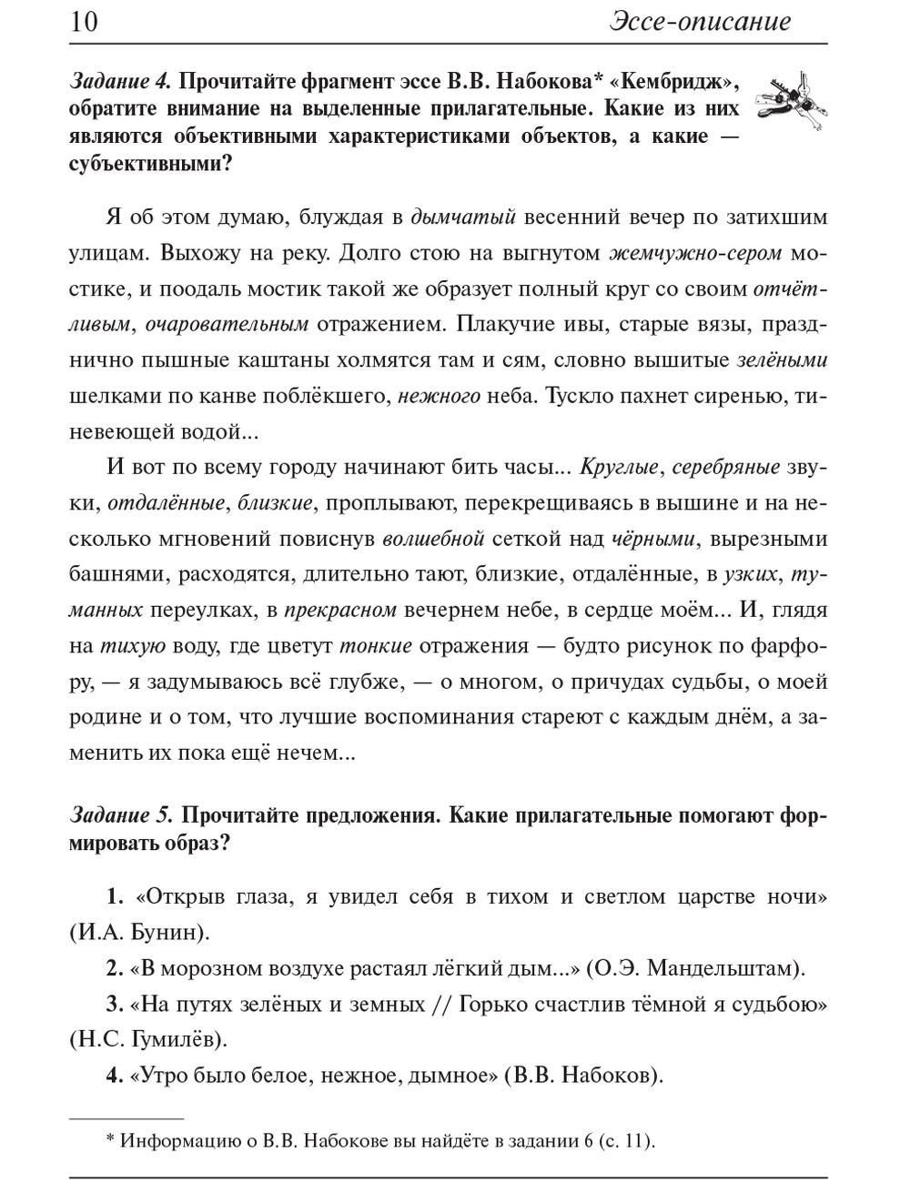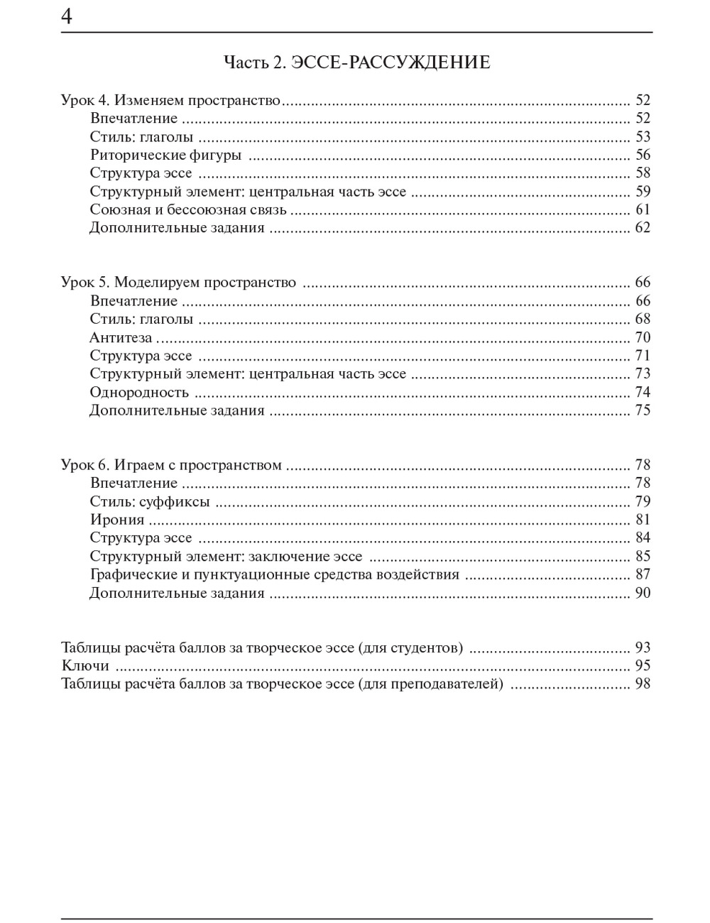Пособие адресовано иностранным студентам, владеющим русским языком на уровне В2 и выше, имеющим словарный запас более 10 тыс. слов и умеющим продуцировать тексты различных жанров и функциональных стилей письменного общения. Целью пособия является развитие речевых способностей иностранных учащихся в результате знакомства со стилистическими и структурными особенностями учебного творческого эссе в двух его разновидностях - эссе-описание и эссе-рассуждение. Пособие рассчитано на 26 часов аудиторной работы, включает теоретическую (таблицы и комментарии) и практическую (упражнения) части. Апробировано на кафедре русского языка как иностранного и методики его преподавания филологического факультета СПбГУ при проведении практических занятий по аспекту "Письмо".