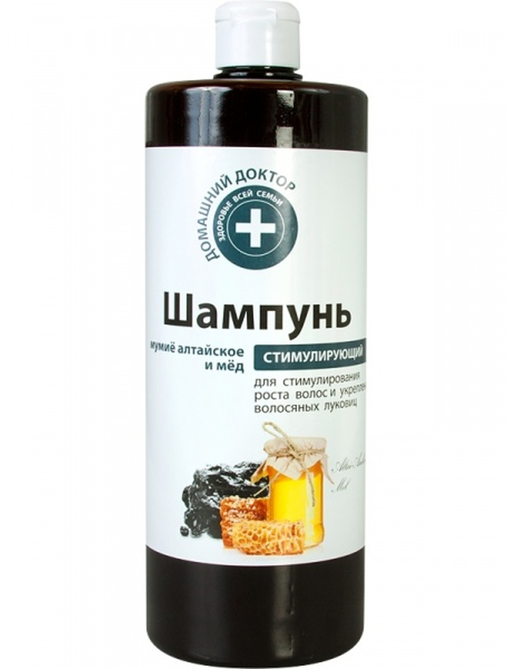 Шампунь «Домашний доктор» мягко очищает волосы и кожу головы. Содержит экстракты мумие алтайского и меда, которые широко применяются для стимулирования роста волос и укрепления волосяных луковиц. Мумие – «горная слеза» - природная смесь органических и неорганических веществ, состоящая из более 80 компонентов. Улучшает внешний вид волос, усиливает их природную красоту. Экстракт меда придает волосам приятную шелковистость.