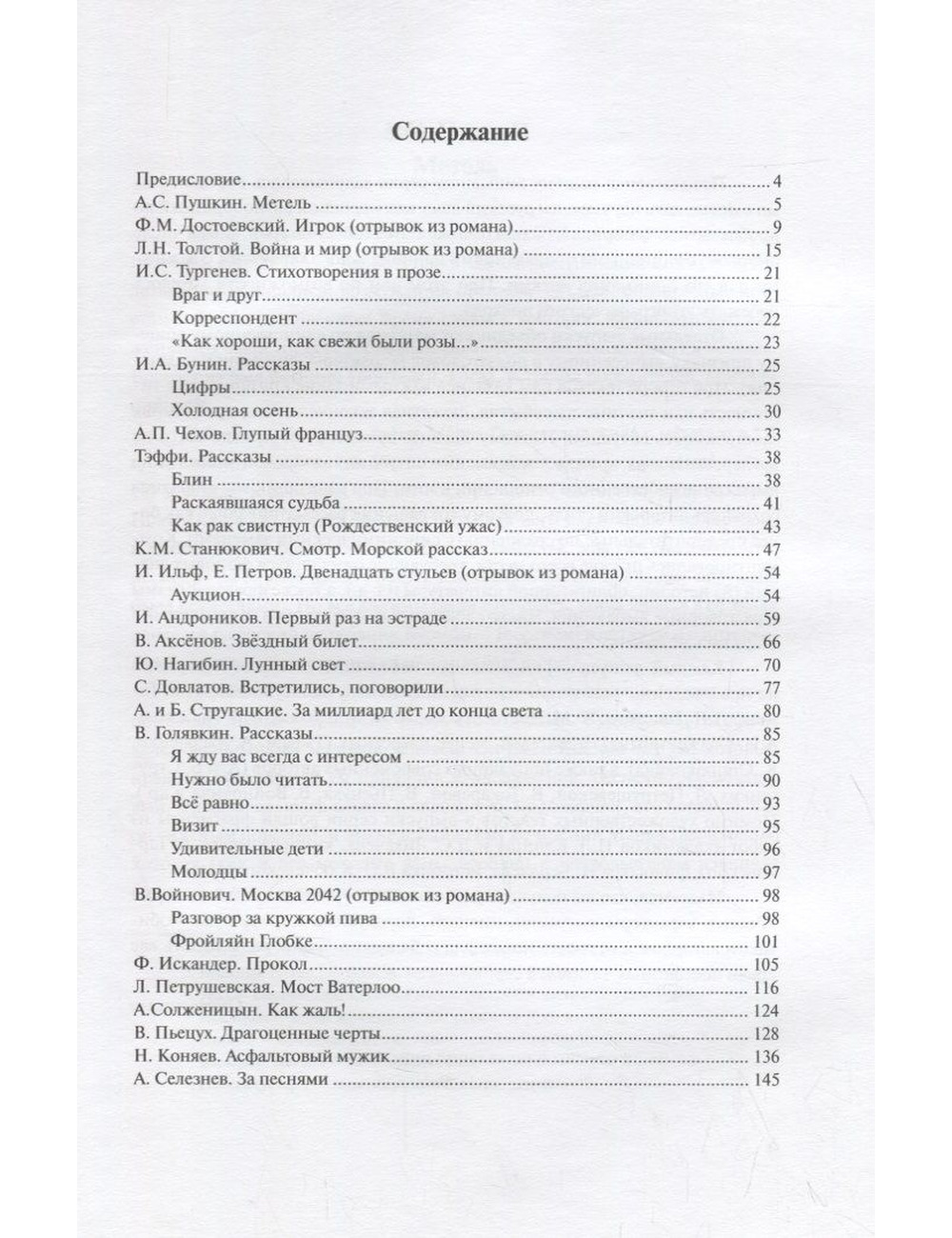 Каждый выпуск серии включает небольшие рассказы и отрывки из произведений всеми признанных классиков (А. С. Пушкина, Н. В. Гоголя, Л. Н. Толстого, Ф. М. Достоевского, М. А. Булгакова, В. В. Набокова, А. И. Солженицына), писателей, менее известных (Тэффи, А. Аверченко, К. Станюковича), а также популярных современных авторов (А. и Б. Стругацких, Л. Петрушевской, В. Токаревой, В. Пьецуха, В. Войновича и др.). Помимо художественных текстов в выпуски серии вошли фрагменты из работ академиков П. Л. Капицы и Д. С. Лихачёва, кинорежиссёра А. Тарковского, философа Н. Бердяева, историка В. О. Ключевского и др.