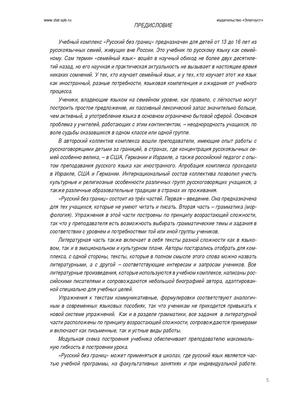 Учебный комплекс «Русский без границ» (в трёх частях) предназначен для детей от 13 до 16 лет из русскоязычных семей, живущих вне России. Это учебник по русскому языку как семейному. Данный комплекс — первая попытка решить методическую проблему преподавания русского языка как семейного не фрагментарно, а комплексно. В авторский коллектив вошли преподаватели, имеющие опыт работы с русскоговорящими детьми за границей. «Русский без границ» может применяться в школах, где русский язык является частью учебной программы, на факультативных занятиях и при индивидуальной работе. Модульная схема построения учебника обеспечивает преподавателю максимальную гибкость в построении урока.