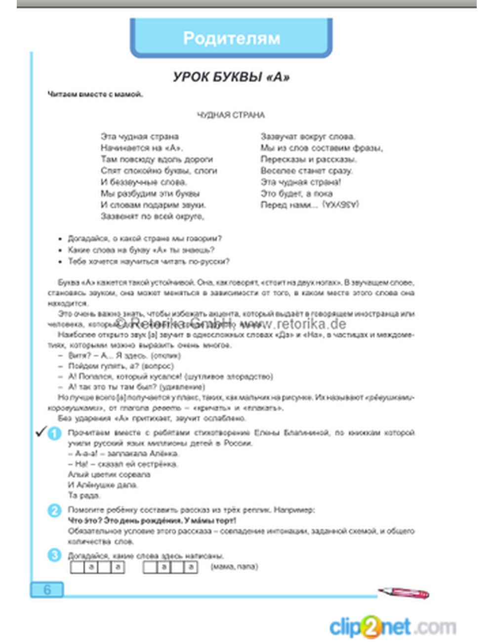 Система уроков в учебнике проста. К каждой главе есть страничка для взрослых. На этой странице даётся подробный обзор хода работы с предлагаемым материалом, расположенным на страницах для детей. К учебнику есть «Рабочая тетрадь для ребёнка». В этой тетради собраны дополнительные задания на обучение ребёнка письму и грамоте. Ребёнок может выполнять все задания прямо в тетради. Задания разработаны в соответствие с материалом в главах учебника.