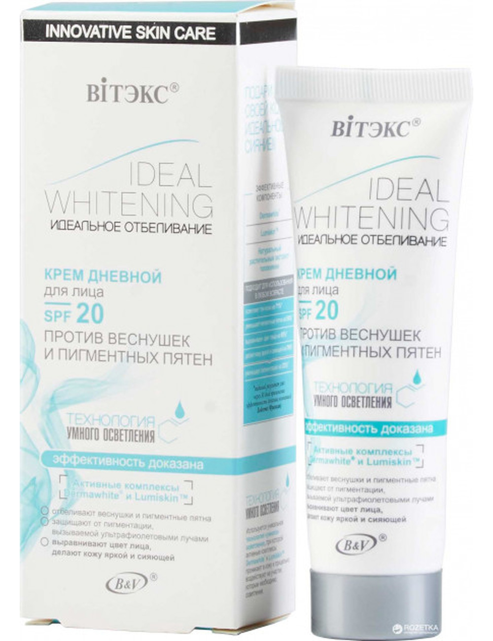 Дневной крем предназначен для отбеливания веснушек и пигментных пятен на разных стадиях процесса пигментации кожи и защиты кожи от негативного влияния факторов окружающей среды, провоцирующих пигментацию. Используется уникальная технология «умного» осветления, при которой активные комплексы Dermawhite и Lumiskin проникают в кожу и прицельно воздействуют на участки, которым необходимо осветление. Натуральный растительный экстракт толокнянки способствует снижению синтеза меланина и увлажняет кожу, препятствует образованию новых пигментных пятен и веснушек. День за днем темные пигментные пятна и веснушки становятся менее заметными, тон кожи выравнивается, кожа становится яркой и сияющей.