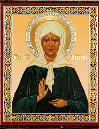 Перед вами образ святой Матроны. Икона выполнена на дереве с использованием техники литографии двойным тиснением. С обратной стороны представлены тропарь и кондак святой. Блаженная изображена на иконе по пояс. Цвет одеяний Матроны на иконе — зеленый. Это связано с канонической традицией изображения одежд блаженных именно зеленого или зеленоватого оттенка. Четки в левой руке Матроны означают ее молитвенный подвиг при жизни. Раскрытая правая ладонь — знак благословления верующих и одно-временно знак открытости святой людям. Блаженная Матрона изображена в белом платке. Здесь главную смысловую нагрузку несет белый цвет, говорящий о святости, чистоте и непорочности. Закрытые глаза Матроны указывают верующим на то, что блаженная обладала прежде всего не физическим, а духовным зрением. Память святой совершается 23 февраля/8 марта, 19 апреля/2 мая.