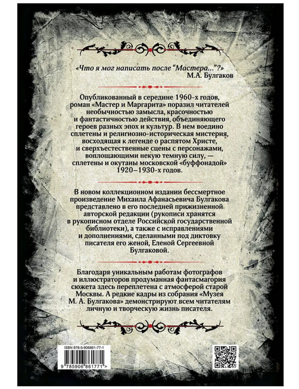 «Мастер и Маргарита» — бессмертное, загадочное и остроумное произведение Михаила Булгакова — главный роман его жизни. «Что я мог написать после “Мастера…”?» — признается себе автор незадолго до своей смерти. Опубликованный в середине 1960-х годов, «Мастер…» поразил читателей необычностью замысла, красочностью и фантастичностью действия, объединяющего героев разных эпох и культур. В нем воедино сплетены и религиозно-историческая мистерия, восходящая к легенде о распятом Христе, и сверхъестественные сцены с персонажами, воплощающими некую темную силу, — сплетены и окутаны московской «буффонадой» 1920-1930-х годов. В новом юбилейном издании бессмертный роман представлен в его последней прижизненной авторской редакции (рукописи хранятся в рукописном отделе Государственной библиотеки СССР имени В.И. Ленина), а также с исправлениями и дополнениями, сделанными под диктовку писателя его женой, Еленой Сергеевной Булгаковой. А уникальные работы фотографов и иллюстраторов отражают атмосферу Москвы «Булгаковской», демонстрируют всем читателям материалы «Музей М.А. Булгакова» и редкие кадры из личной и творческой жизни автора.