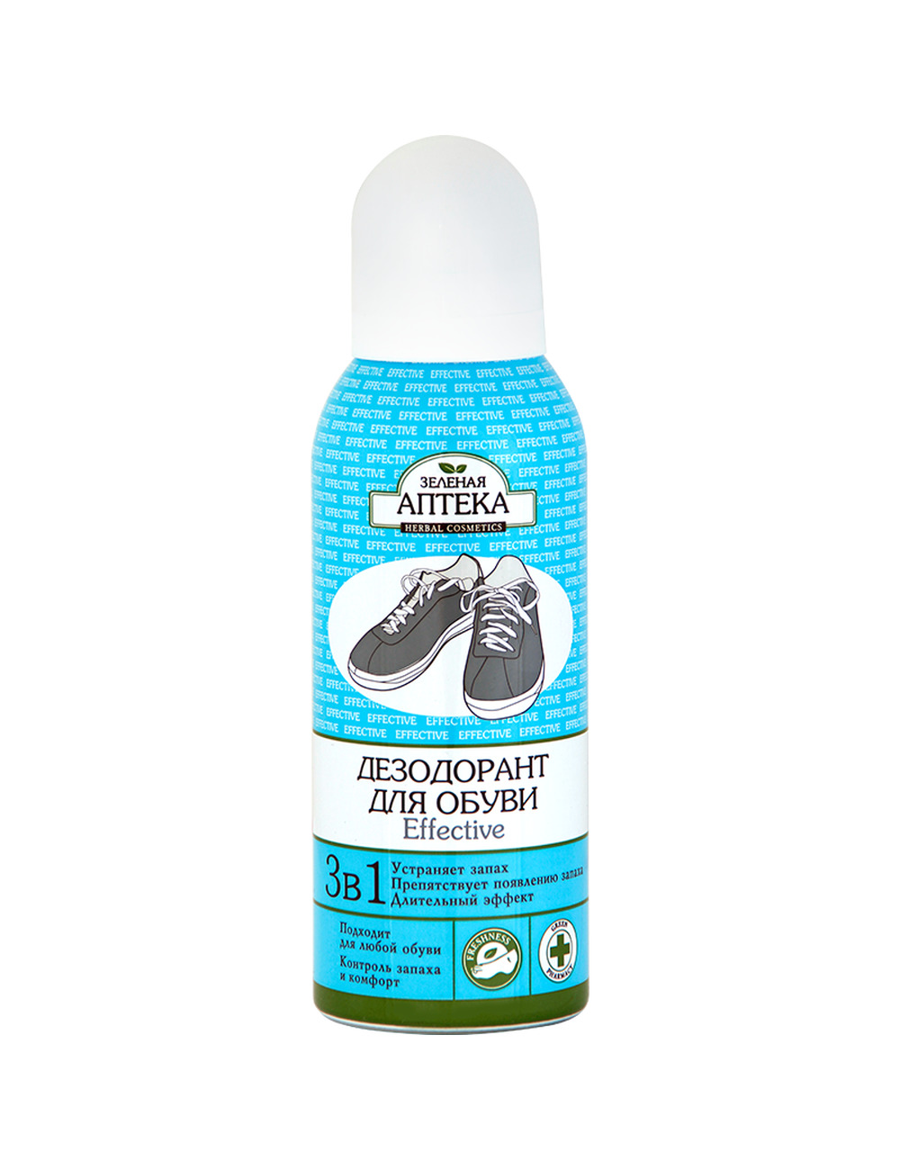 Дезодорант для обуви Effective содержит в составе интенсивные компоненты, которые дезинфицируют обувь, способствуя созданию благоприятного микроклимата для ног и устраняя бактерии, являющиеся причиной появления неприятного запаха. Ароматические отдушки с легким ненавязчивым запахом усиливают дезодорирующий эффект. Средство может использоваться для любого материала: натуральной кожи, кожзаменителя, ткани и замши. Спрей не портит обувь, он быстро высыхает не оставляя пятен.