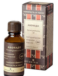 Упругость и тонус (содержит омега 9). Масло авокадо получают из высушенной мякоти и – в редких случаях – ядер плодов одноименного вечнозеленого дерева, произрастающего в Мексике, Центральной и Южной Америке, Центральной и Южной Африке, Израиле, Новой Зеландии и США (Калифорния). Этот идеальный косметический продукт для увлажнения и питания кожи содержит витамины А, В1, В2, С, D, Е, F, Н, РР, К, цинк, калий, лецитин, соли фосфорной кислоты, сквален, фитостеролы, плодовые экстракты, микро- и макроэлементы. Также в состав масла входят жирные кислоты: олеиновая, пальмитиновая, линолевая, линоленовая, пальмитолеиновая, стеариновая.