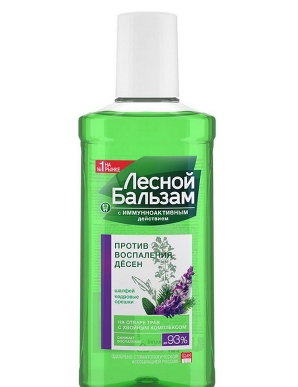 Эффективное средство для полоскания десен при воспалении (гингивите), обладает выраженным противовоспалительным эффектом. В состав ополаскивателя входит хвойный комплекс с экстрактом шалфея, маслом кедровых орешков, отваром трав и соком алоэ. Сбалансированный растительный состав способствует снижению воспаления десен и стимулирует восстановление мягких тканей полости рта. Антибактериальные субстанции хвойных экстрактов блокируют развитие воспалительного процесса в десне, снижая риск обострения проблем с деснами. Рекомендован стоматологами для ежедневного использования при легких и хронических формах гингивита и пародонтита. Уже с первого применения исчезает болезненность десен. Снижает воспаление десен до 93%. В 2 раза снижает бактериальную нагрузку на мягкие ткани полости рта. Сохраняет баланс естественной микрофлоры полости рта при длительном использовании.