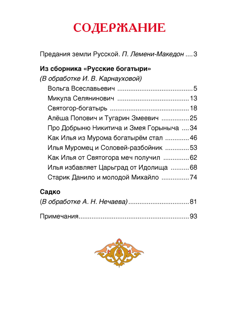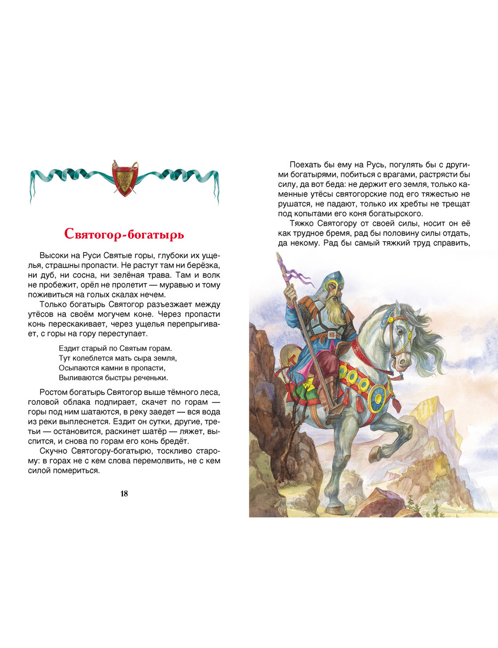 В книгу вошли былины о русских богатырях, а также отрывок былины «Садко», рекомендованные к изучению по внеклассной программе. Содержание: «Вольга Всеславьевич», «Микула Селянинович», «Святогор-богатырь», «Алёша Попович и Тугарин Змеевич», «Про Добрыню Никитича и Змея Горыныча», «Как Илья из Мурома богатырём стал», «Илья Муромец и Соловей-разбойник», «Как Илья от Святогора меч получил», «Илья избавляет Царьград от Идолища», «Старик Данило и молодой Михайло» в обработке И. Карнауховой, «Садко» в обработке А. Нечаева.