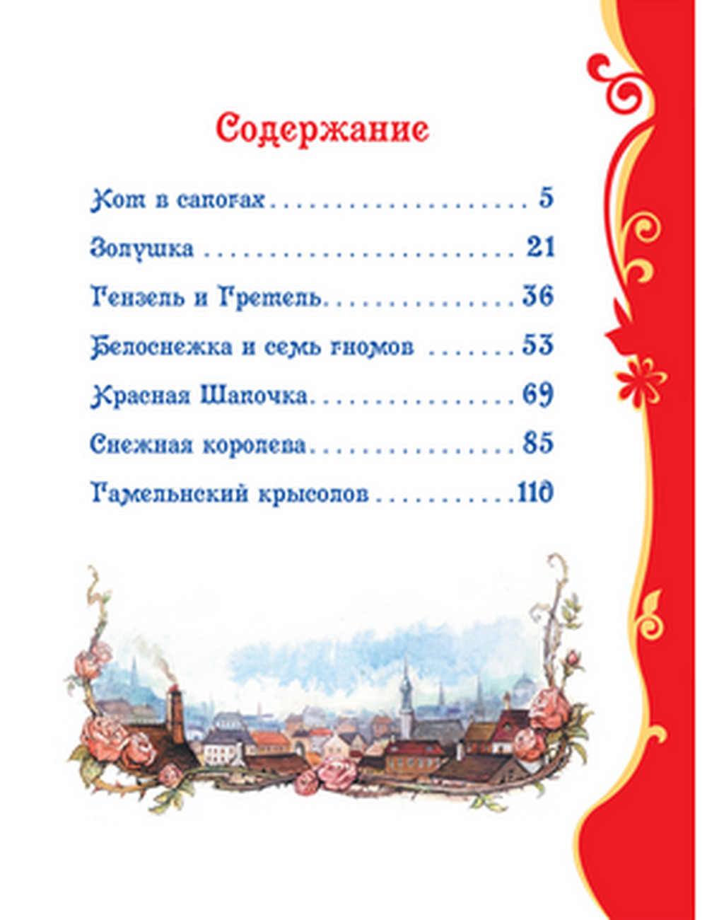 В сборник вошли известные сказки в пересказе для детей: «Кот в сапогах», «Золушка», «Гензель и Гретель», «Белоснежка», «Красная Шапочка», «Снежная королева» и «Гамельнский крысолов». Классические сюжеты проиллюстрированы замечательным английским художником и писателем Джоном Пейшенсом.