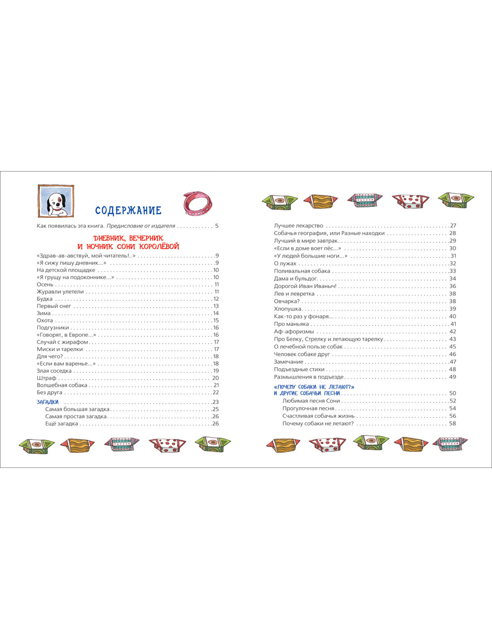 Маленькая собачка Соня не только умная и знаменитая, но еще и очень талантливая! Она сочиняет стихи обо всем, что с ней происходит, и записывает их в свой «Дневник» (он же «вечерник и ночник», ведь к настоящему поэту вдохновение приходит не только днем!). О вредной соседке Пчелкиной, о любимом хозяине Иване Иваныче, о воющем пылесосе, о Белке, Стрелке и летающей тарелке — словом, обо всем на свете вы прочитаете в стихах маленькой, но очень умной собачки, полюбившейся и большим, и маленьким читателям.