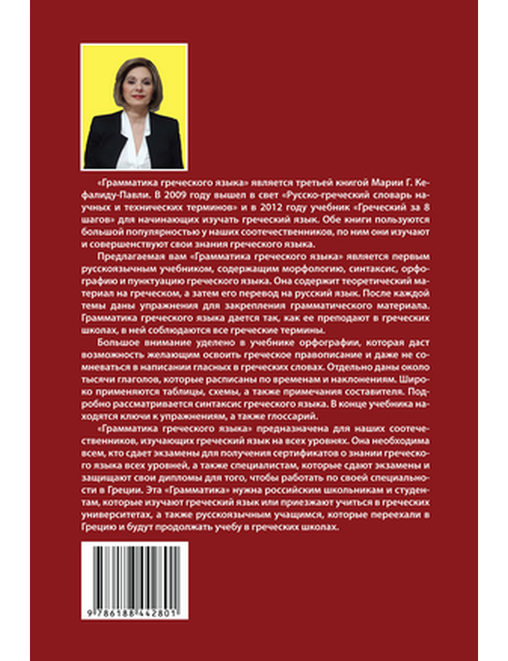 "Грамматика греческого языка" предназначена для наших соотечественников, изучающих греческий язык на всех уровнях. она необходима всем, кто сдает экзамены для получения сертификатов о знании греческого языка всех уровней, специалистам, сдающим экзамены для подтверждения диплома, а также школьникам и студентам, приезжающим учиться в греческих школах и высших учебных заведениях.