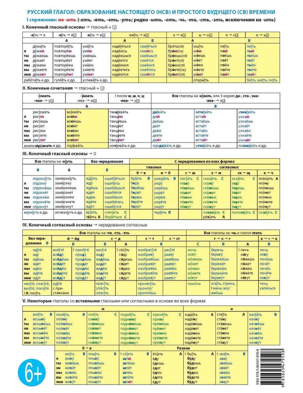 Разноцветная таблица-подсказка для уровней А1-В1 (начальный и средний этапы обучения, элементарный, базовый и первый уровни). Представляет модель образования личных форм глаголов настоящего и простого будущего времени всех классов и групп в соответствии с лексическим минимумом первого сертификационного уровня.