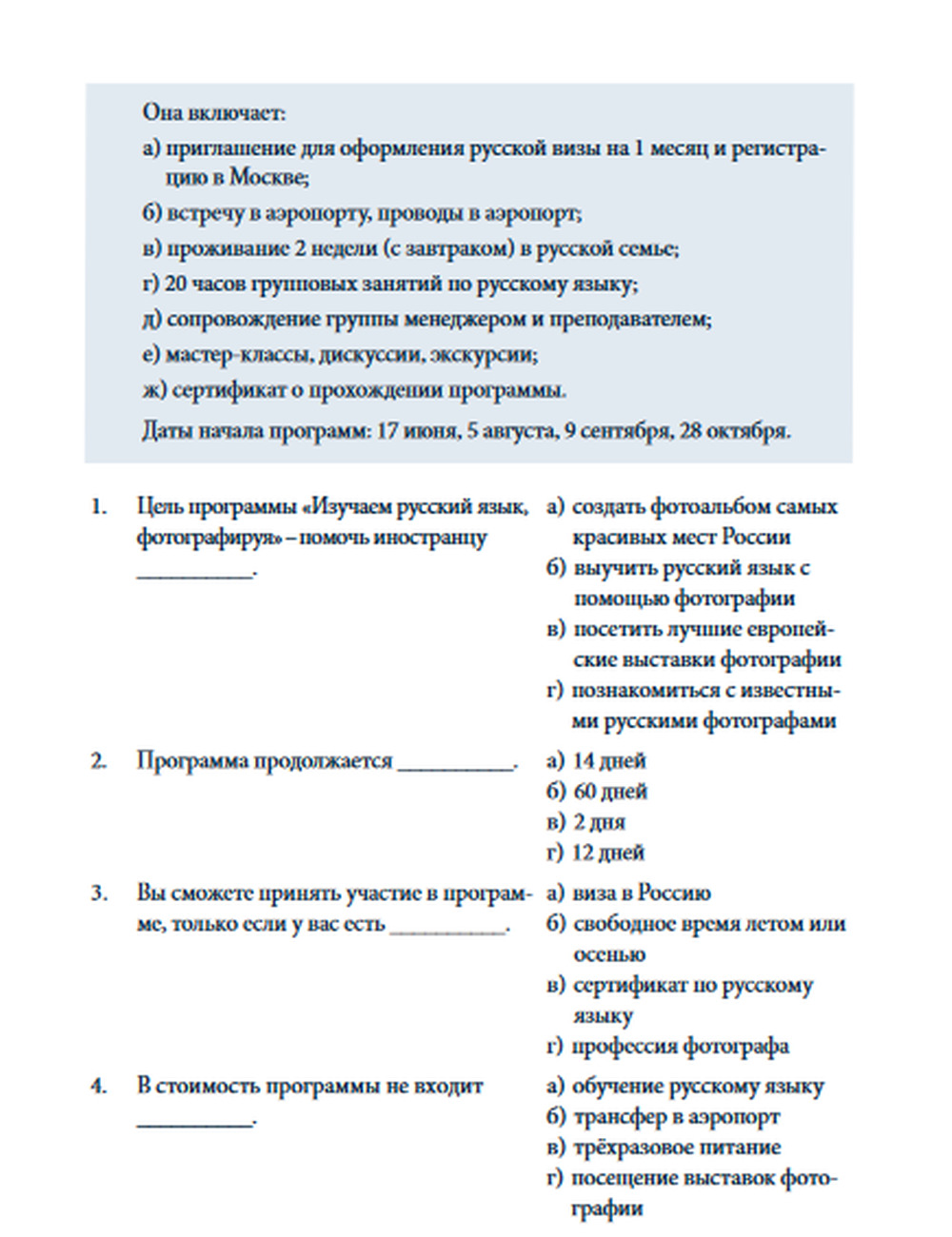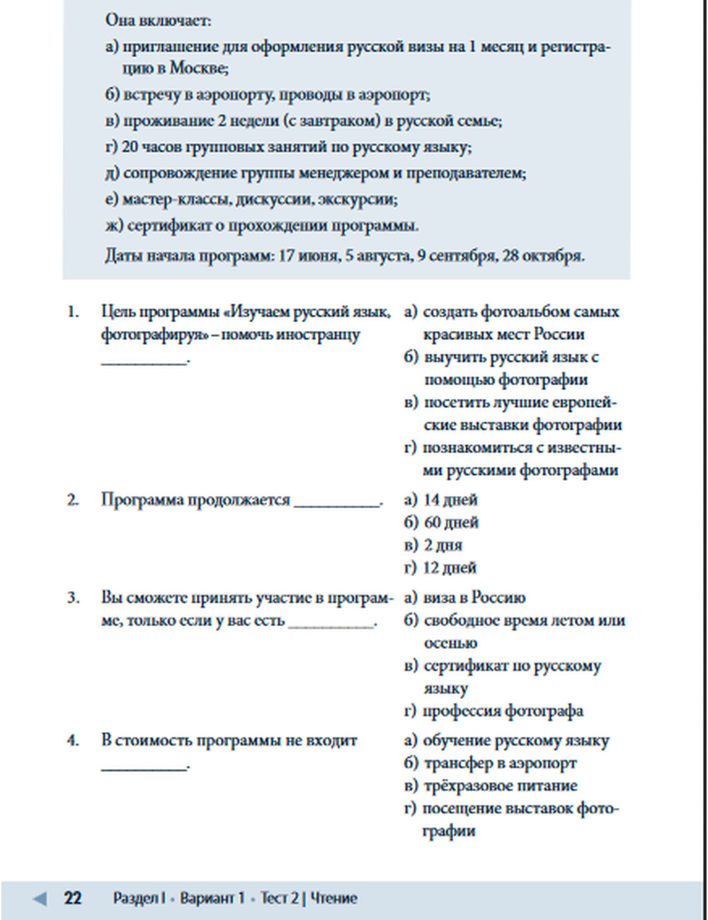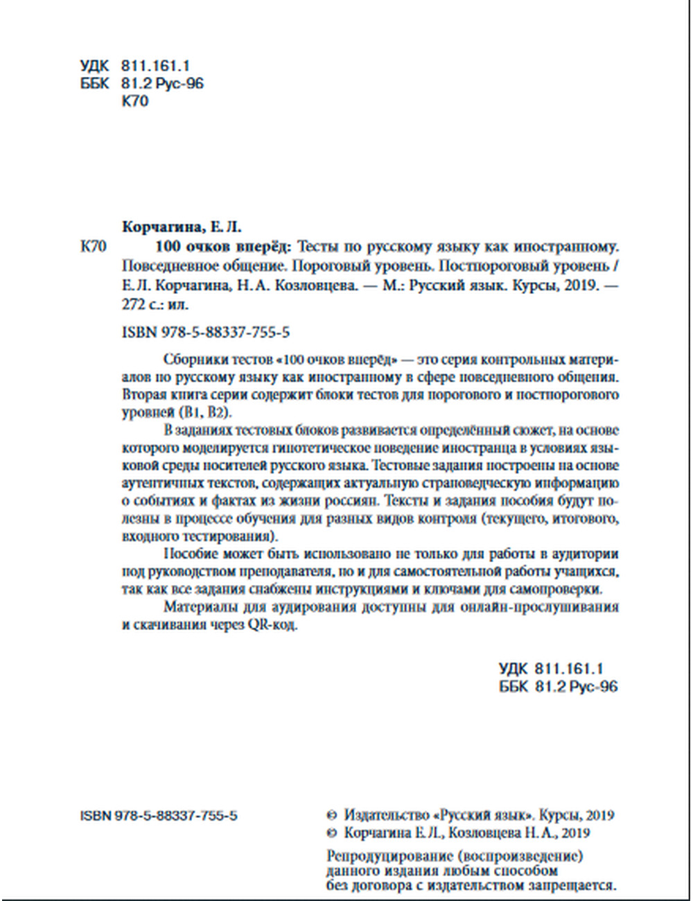 Сборники тестов «100 очков вперёд» — это серия контрольных материалов по русскому языку как иностранному в сфере повседневного общения. Вторая книга серии содержит блоки тестов для порогового и постпорогового уровней (Bl, В2).