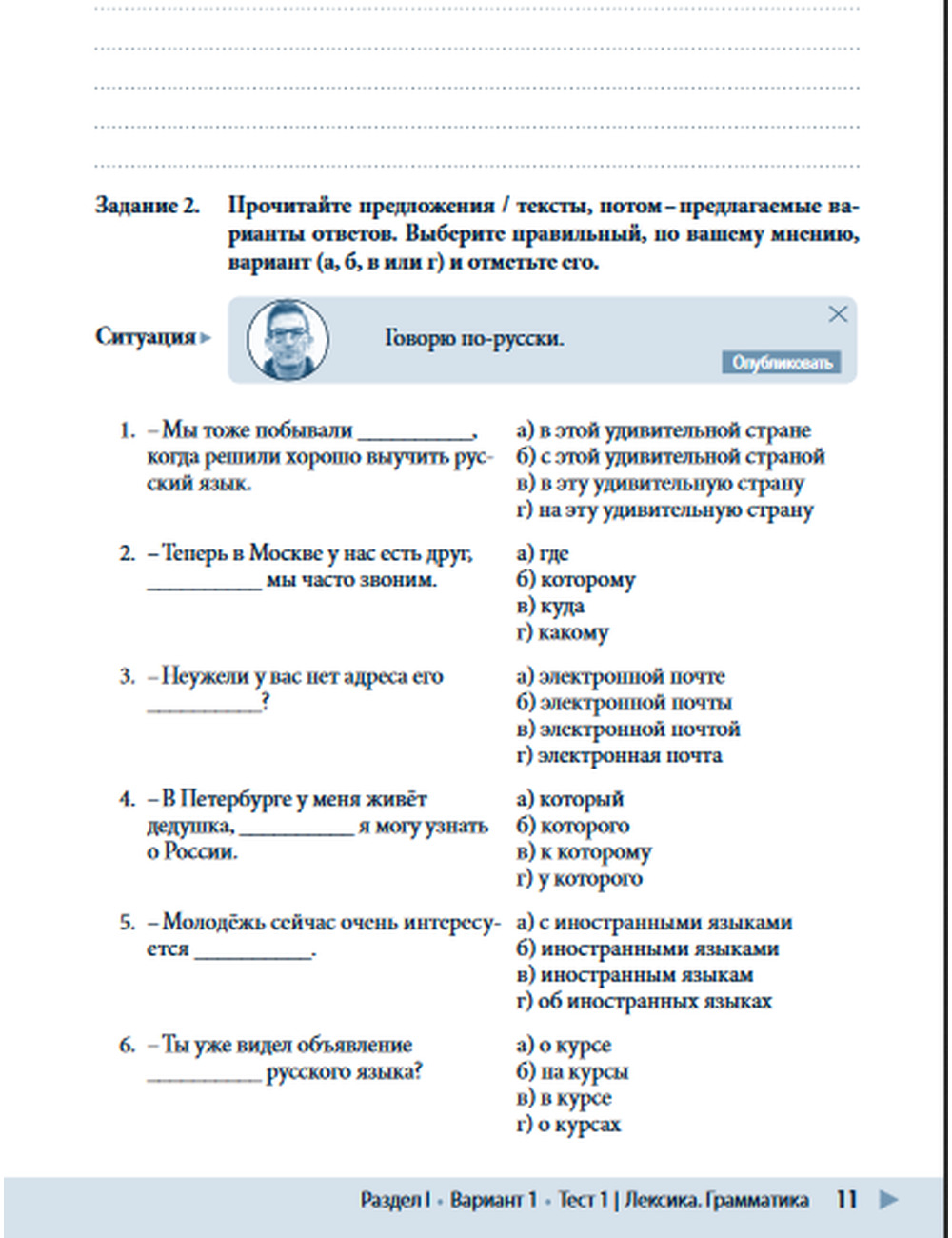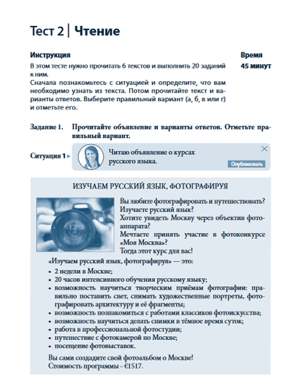 Тестовые задания построены на основе аутентичных текстов, содержащих актуальную страноведческую информацию о событиях и фактах из жизни россиян. Тексты и задания пособия будут полезны в процессе обучения для разных видов контроля (текущего, итогового, входного тестирования).