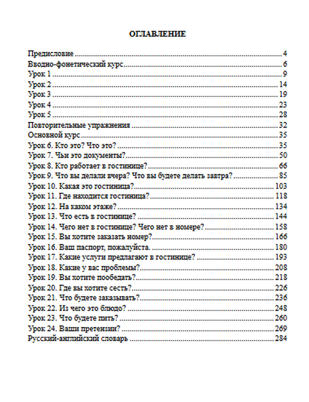 The manual is organized thematically. Topics (“Hotel”, “Room”, “Services”, etc.) correspond to the specifics of the sphere of communication and the most relevant situations.